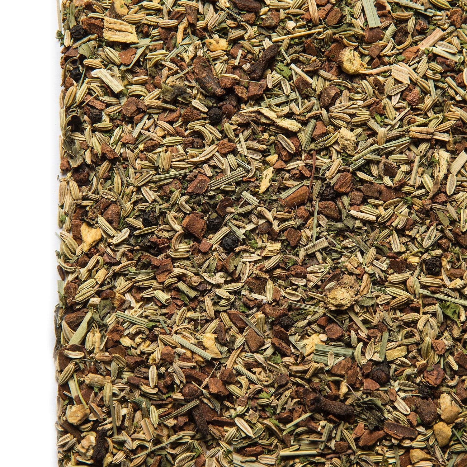 Zutaten: Fenchel*, Zimtstücke*, Ingwer*, SÜSSHOLZ*, Zitronengras*, Schwarzer Pfeffer*, Pfefferminze*, Gewürznelken*, Petersilie*.