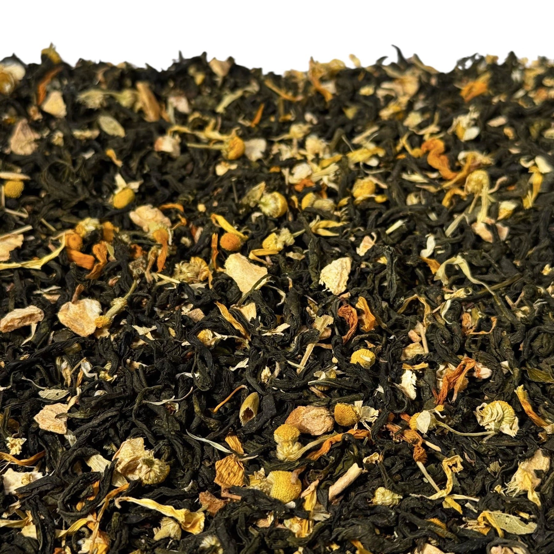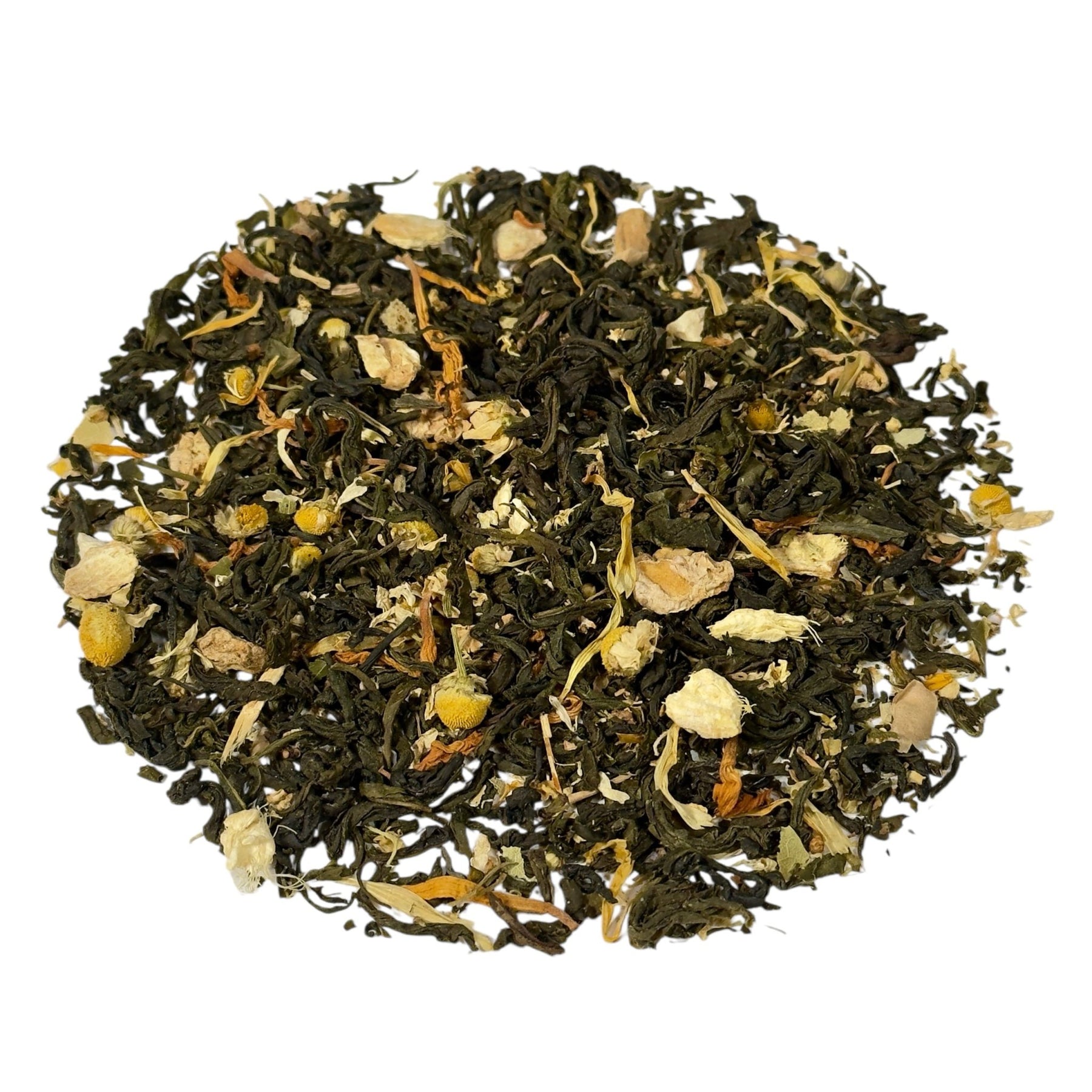 | Zutaten: | Grüner Tee China Wu Lu*, Ingwerstücke*, natürliches Frucht-Zitrus-Aroma, Kamillenblüten* (4%), Zitronenschalen* (2%), Lindenblüten*, Holunderblüten*, Ringelblumenblüten*, Sonnenblumenblüten*. * = aus kontrolliert biologischem Anbau |
