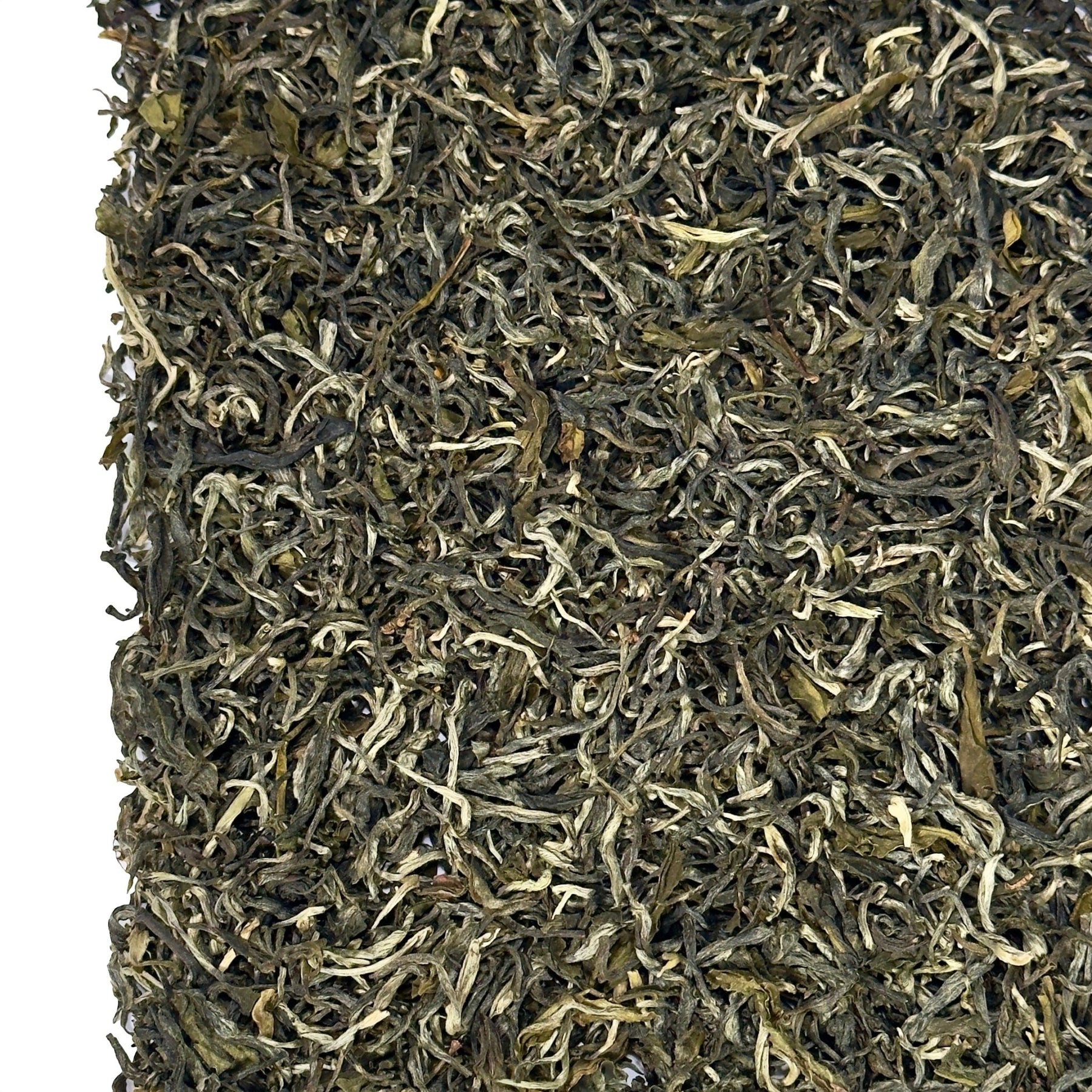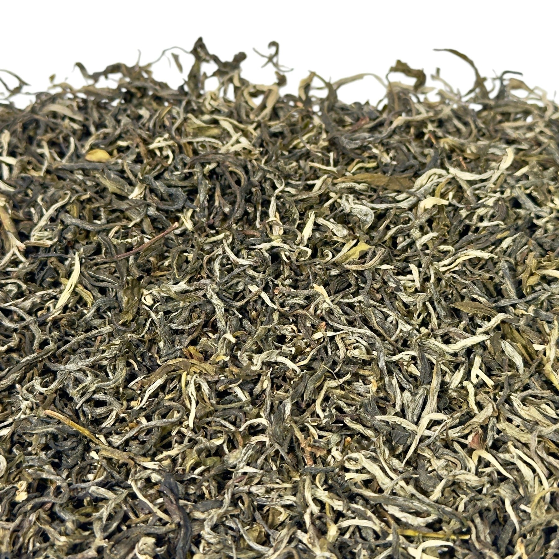 Schon das trockene Blattgut fällt ins Auge. Große, offene Blätter in einem hellen Grün dominieren das Bild. Dazu kommt ein hoher Anteil silbrig schimmernder Blattspitzen, die dem Tee eine edle und fast schon zarte Ausstrahlung verleihen. Diese Kombination wirkt nicht nur optisch ansprechend, sondern gibt auch einen Hinweis auf die sorgfältige Verarbeitung. Alles wirkt leicht, luftig und natürlich – ohne unnötige Bruchstücke oder grobe Bestandteile.