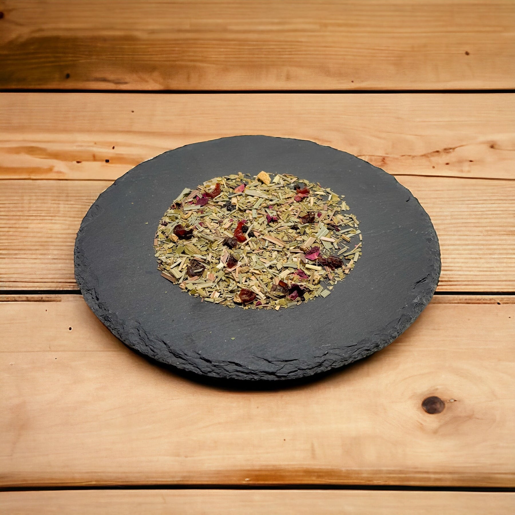 Zutaten: | grüner Mate-Tee, Zitronengras, Hagebuttenschalen, Ingwerstücke, schwarzer Pfeffer, ganzer Kardamom, Basilikum, Rosenblüten, Römische Kamille |