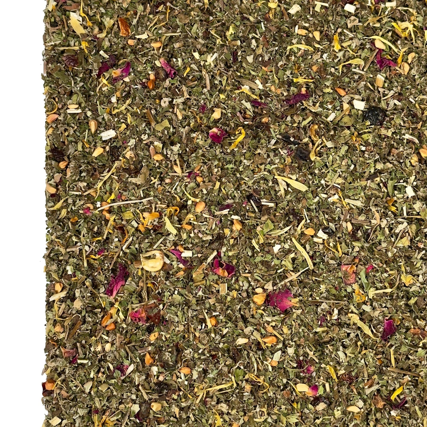 | Zutaten: | Brombeerblätter, Himbeerblätter, Pfefferminzblätter, Hagebuttenschalen, Hagebuttenkerne, Riesengoldrutenkraut, Spitzwegerichkraut, Melissenblätter, Ringelblumenblüten, Rosenblütenblätter, Heidekrautblüten |