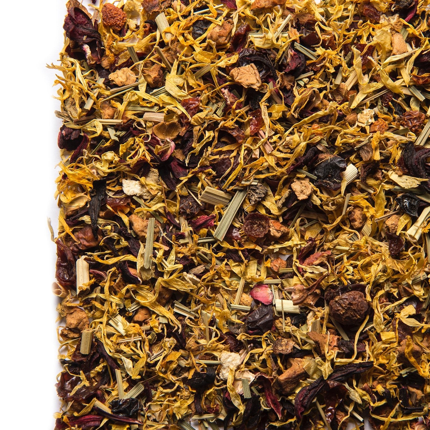 Zutaten: | Hagebuttenschalen*, Hibiskusblüten*, Apfelstücke*, Zitronengras*, Ringelblumenblüten*, Zitronenschalen* (3%), SÜSSHOLZ*, natürliches Zitronen-Aroma, Krauseminze*. * = aus kontrolliert biologischem Anbau |