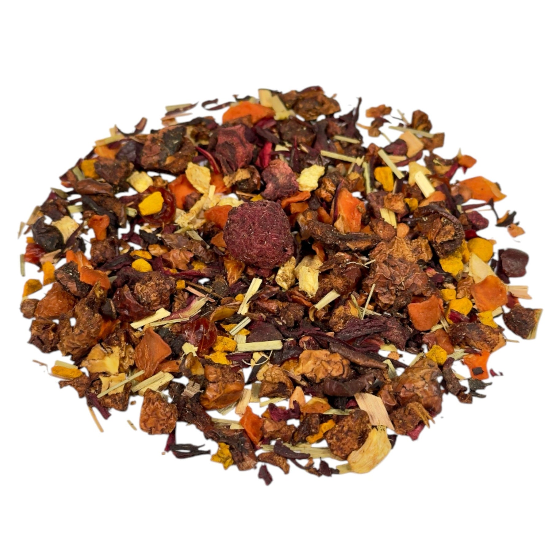 Die Johannisbeere ist der Star dieses Tees und verleiht ihm einen fruchtigen, leicht säuerlichen Kick, der an frische Sommerfrüchte erinnert. Ihre Aromen sind voll und ausdrucksstark, ohne zu überwältigen, was sie zu einem idealen Partner für die sanfte, erdige Kurkuma macht. Es ist, als ob der Tee dir mit jedem Schluck ein Stückchen Sommer schenkt.