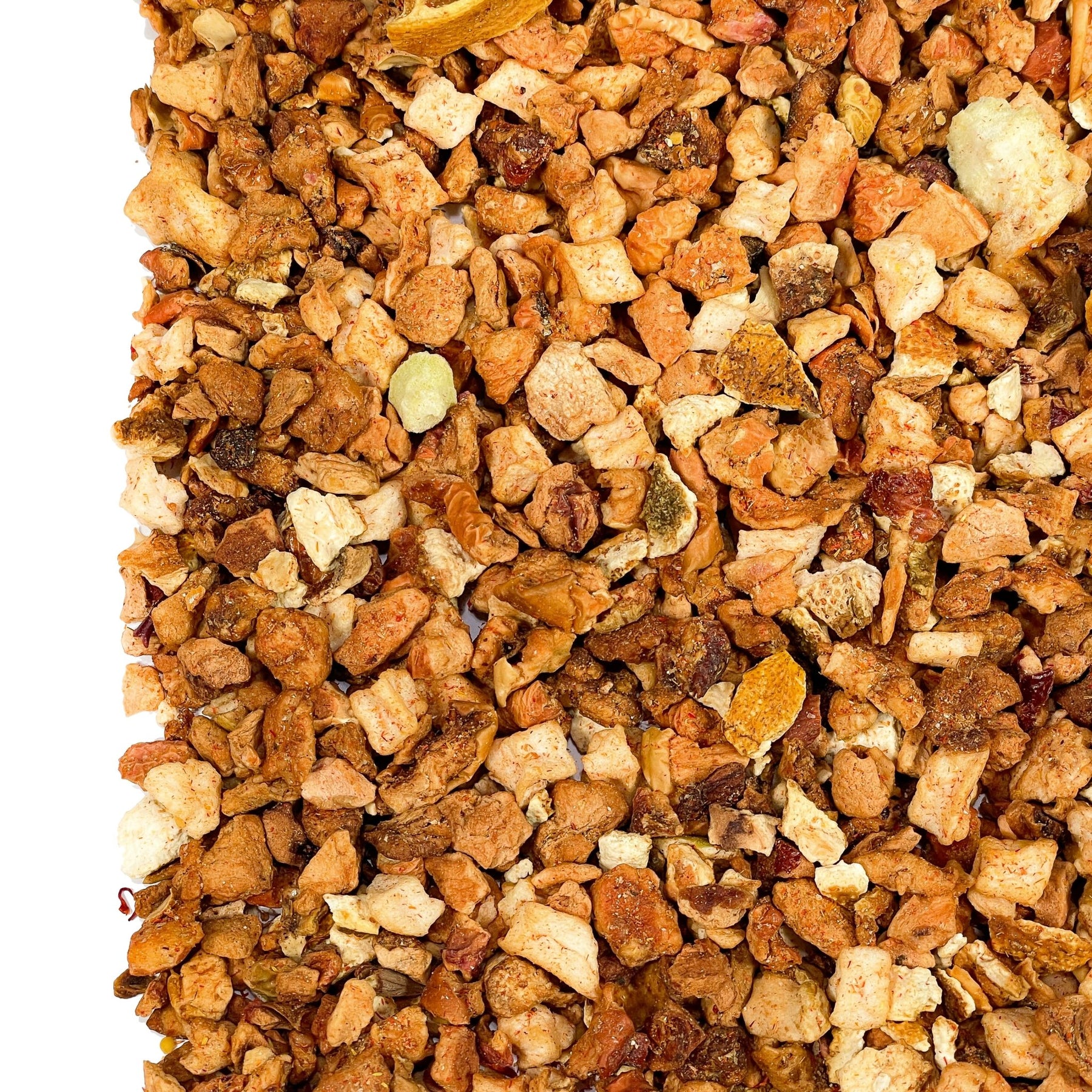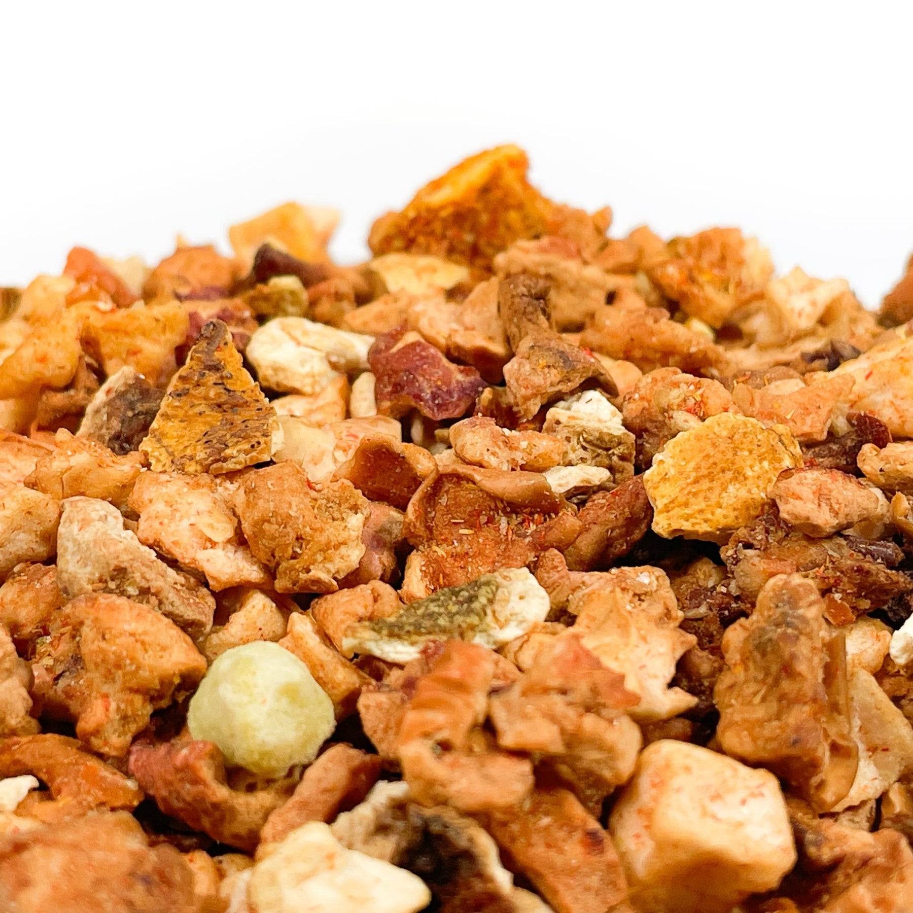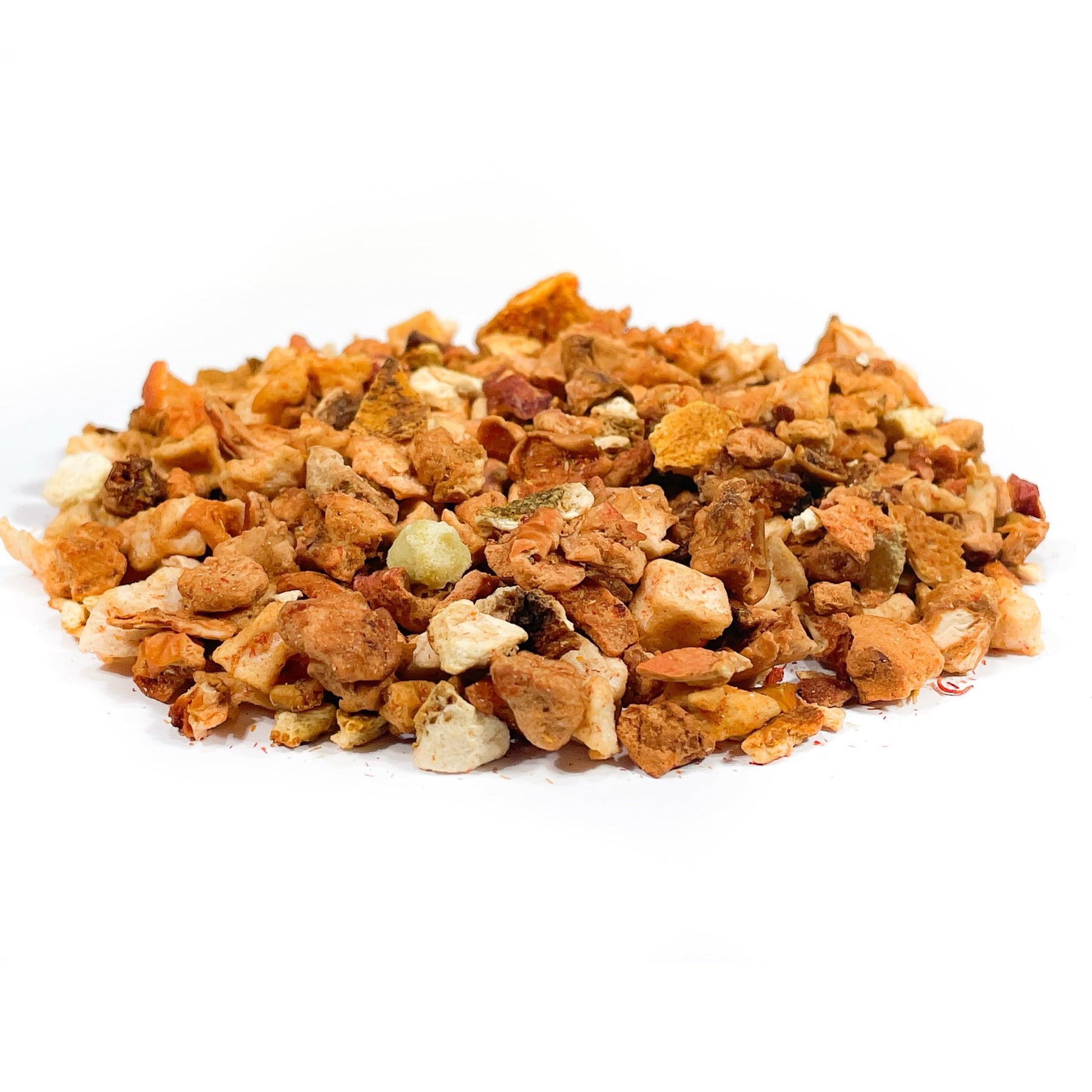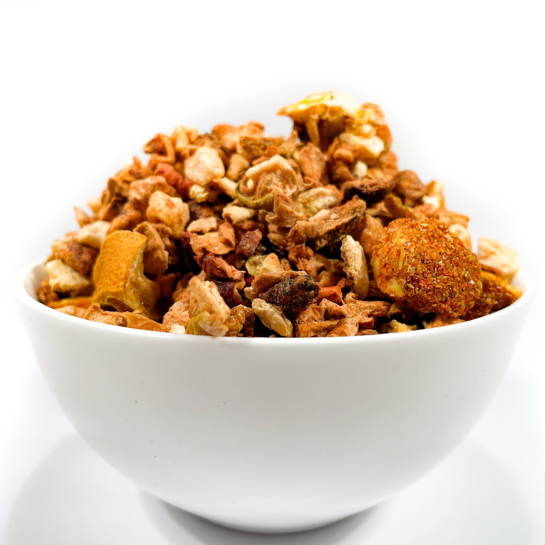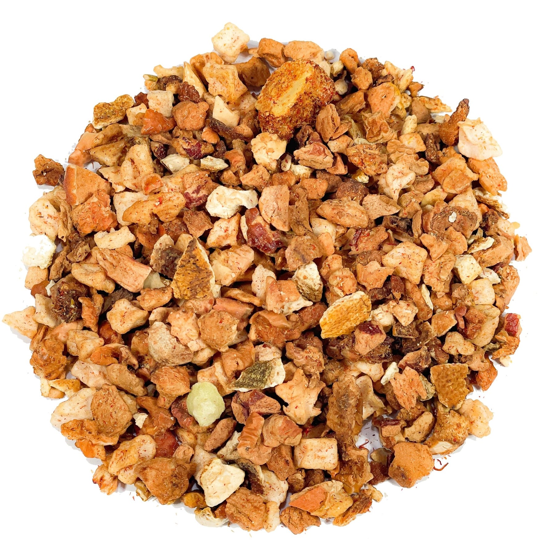 Zutaten: | Apfelstücke, Orangenschalen, gefr.-getr. Apfelstücke, Orangenspalten, gefr.-getr. Physalis, Aroma, Färberdisteln |