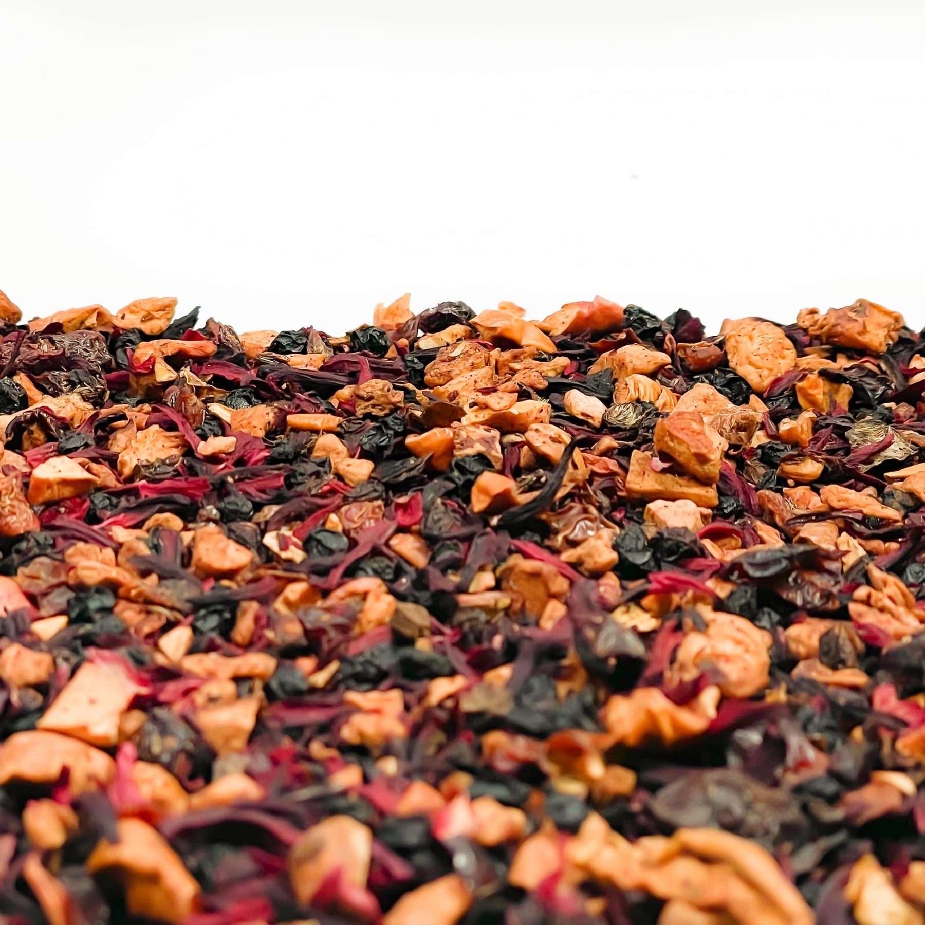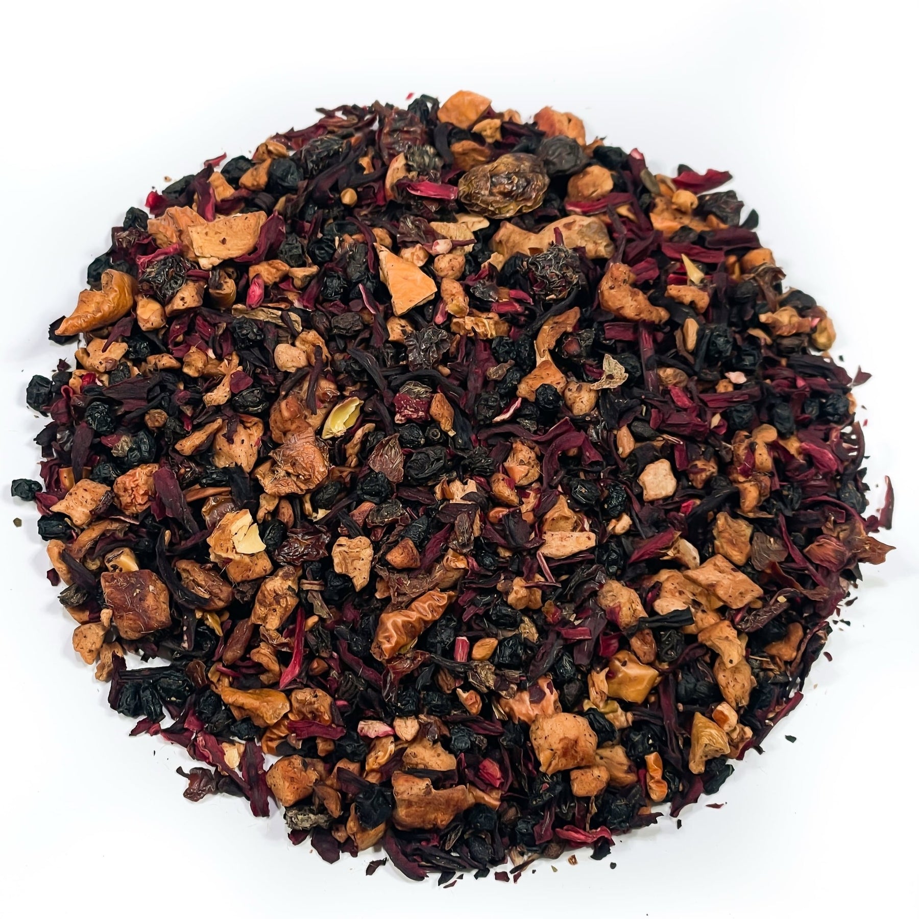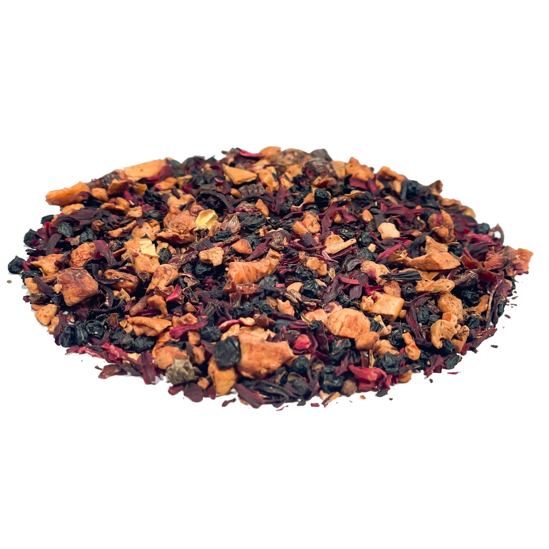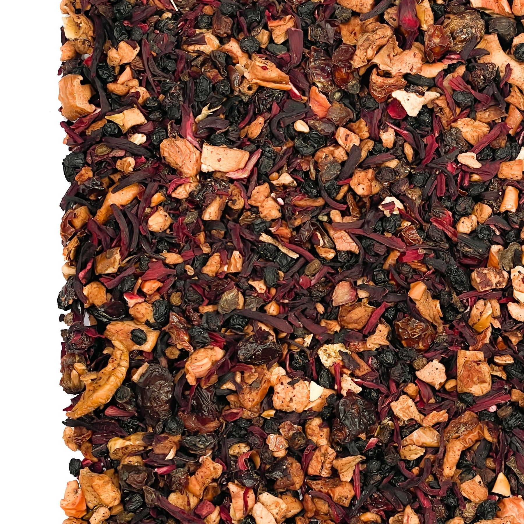 Zutaten: Hibiskusblüten, Apfelstücke, Fliederbeeren, Hagebuttenschalen, gefr.-getr. Sauerkirschstücke, Aroma
