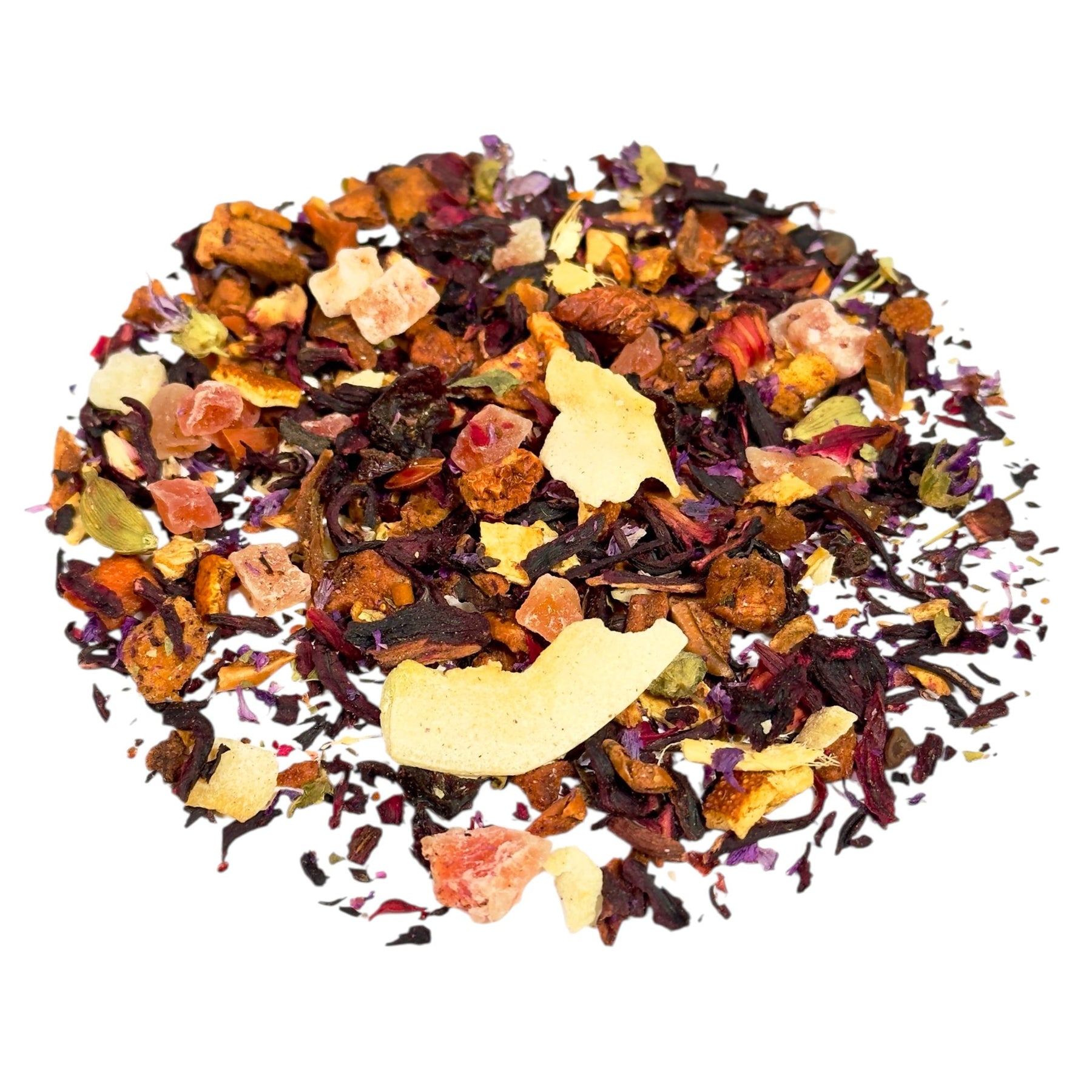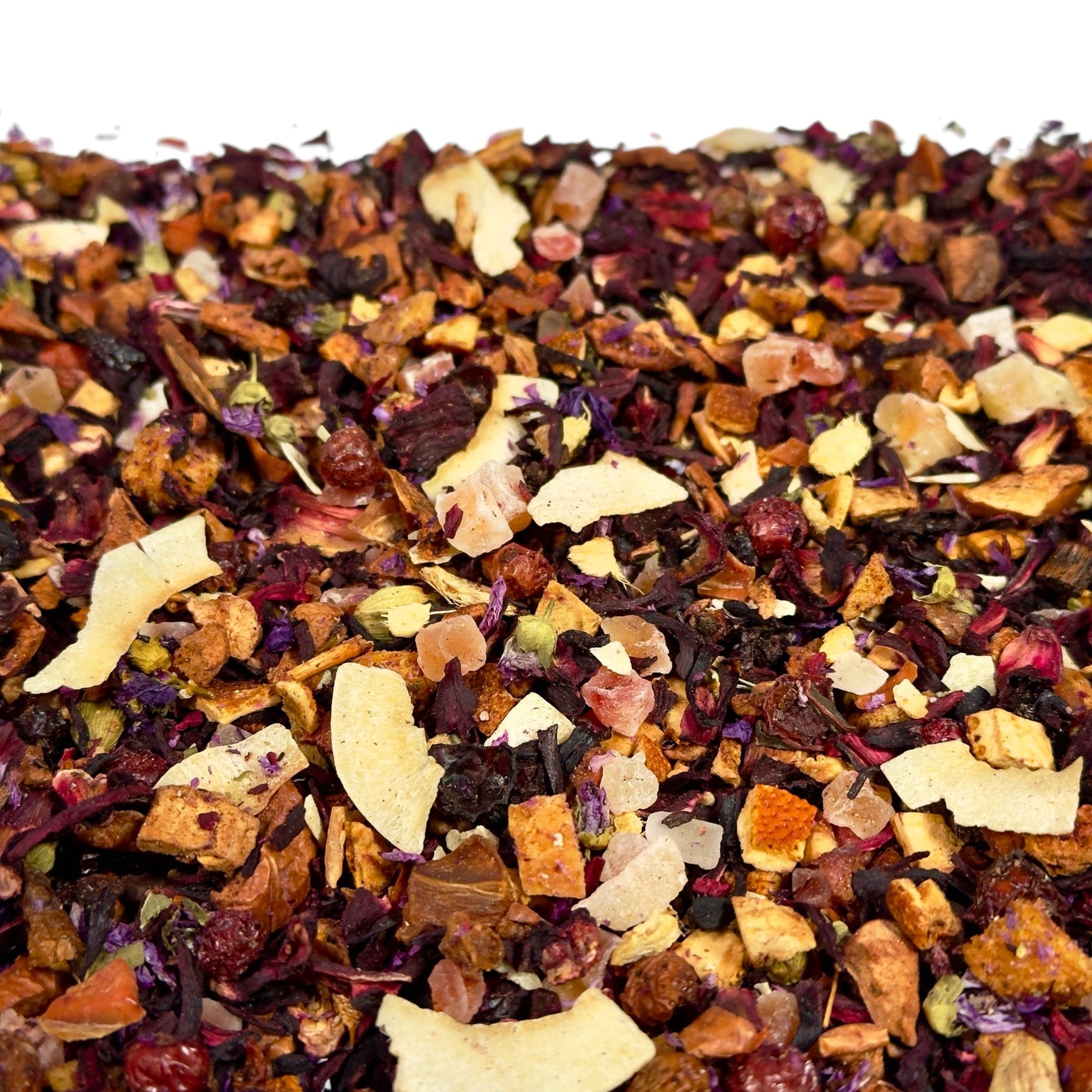 | Zutaten: | Hibiskusblüten, Apfelstücke, kandierte Papayastücke (Papaya, Zucker), Orangenschalen, Aroma, Karottenstücke, Hagebuttenschalen, Ingwerstücke (4%), Kokoschips (Kokosnuss, Zucker), Kardamom, Malvenblüten, rote Johannisbeeren, Vanillestücke, Marillenstücke (1%) |