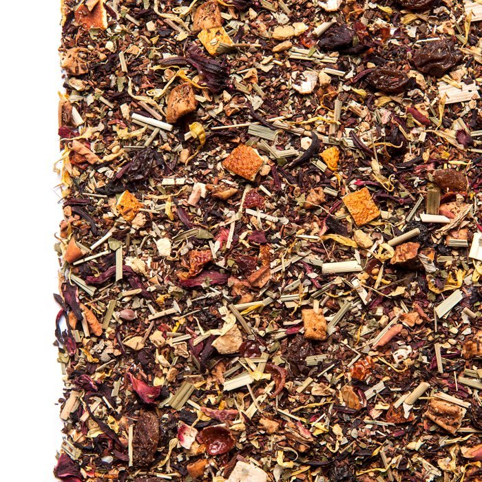 Für Süße und Flavour zeichnen Honigbuschtee, Ringelblumenblüten und Hibiskusblüten verantwortlich, den spitzig-frischen Zuschuss liefert Lemongras.