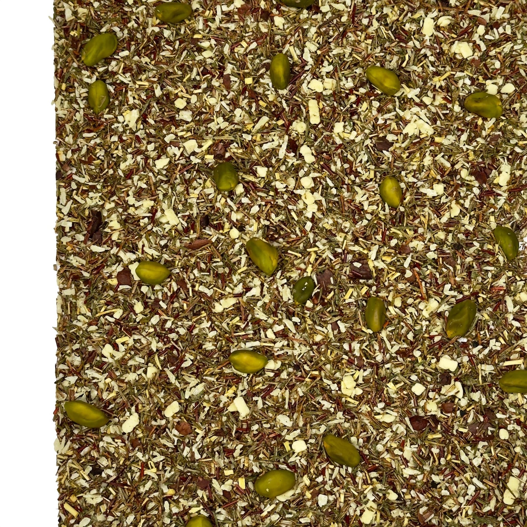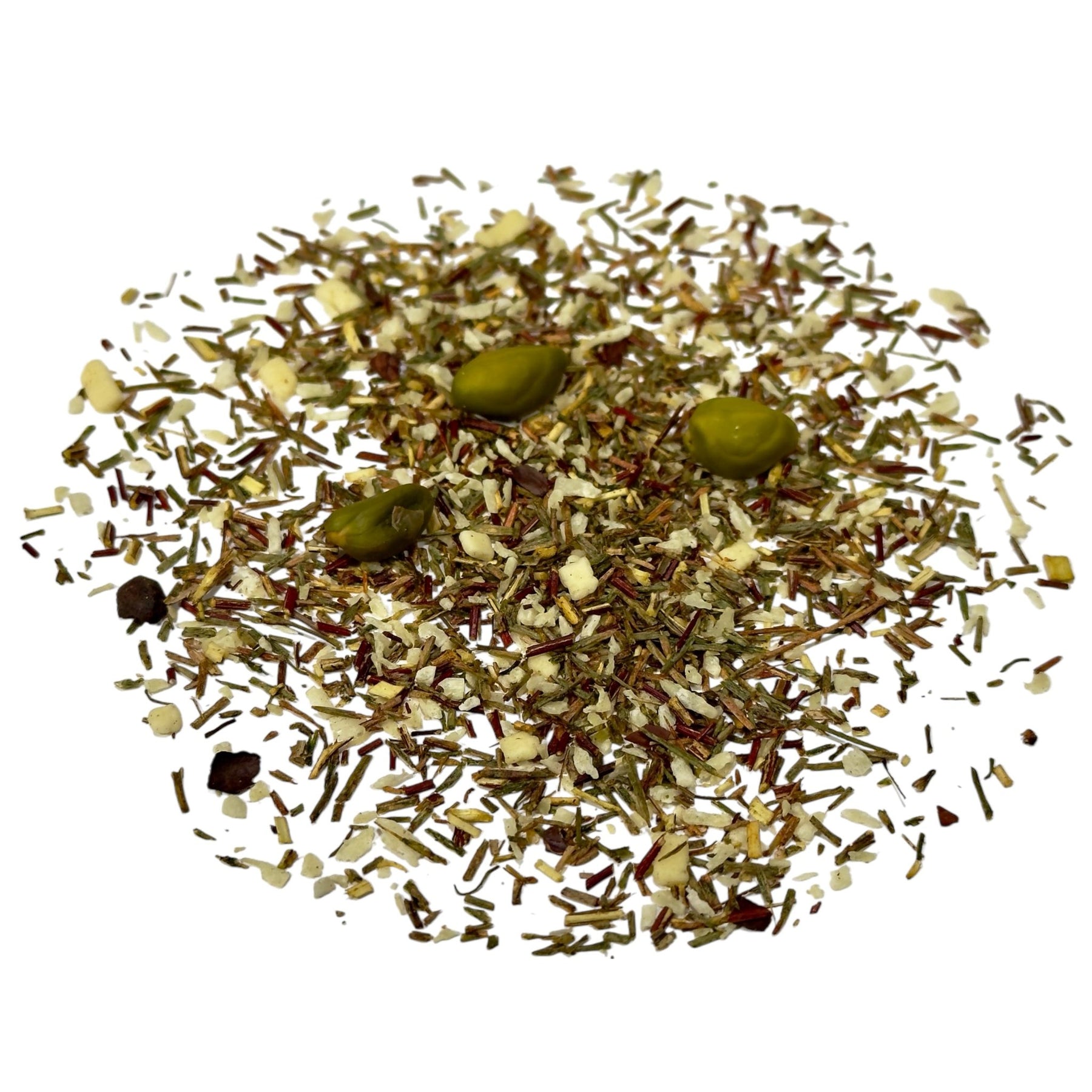Zutaten: | grüner Rotbuschtee, Kokosraspeln, weiße Schokoladenplättchen (Zucker, Kakaobutter, MILCHPULVER, Dextrose, Emulgator: SOJA-LECITHIN) (10%), PISTAZIEN, Kakaoschale, Aroma |