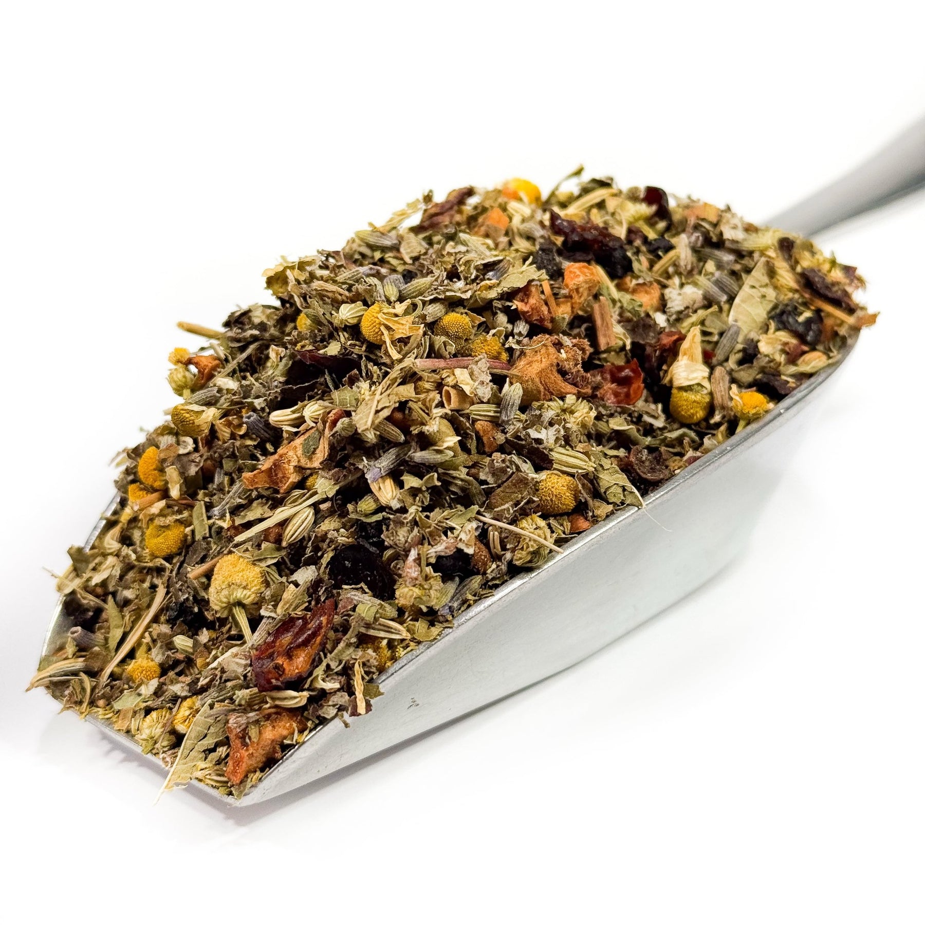 | Zutaten: | Apfelstücke, Fenchel, Fliederbeeren, Hagebuttenschalen, Kamille, Himbeerblätter, Zitronenverbenenblätter, Lavendelblüten, Aroma, gefr.-getr. Himbeeren |