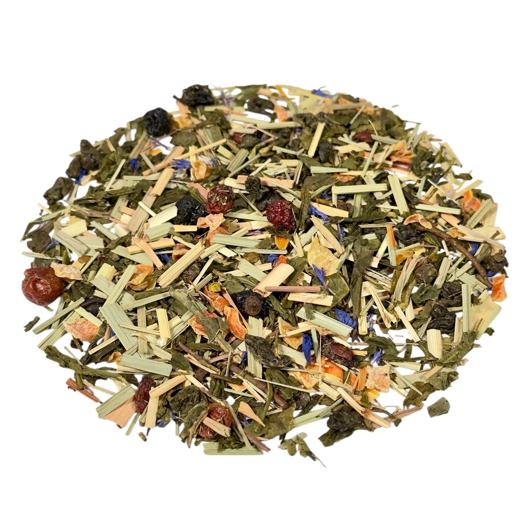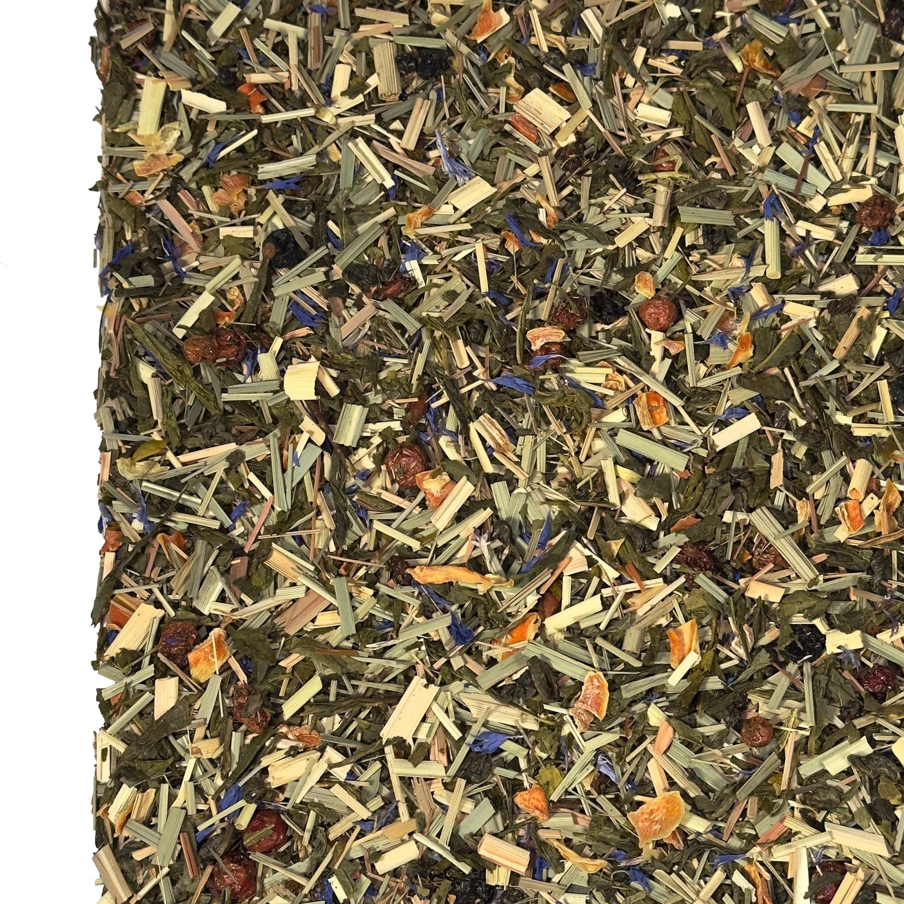 | Zutaten: | Grüner Tee (49%), Zitronengras, Karottenstücke, Schwarze Johannisbeeren (5%), Rote Johannisbeeren (4%), Granatapfelkerne (3%), Aroma, Kornblumenblüten, Granatapfelblüten. |