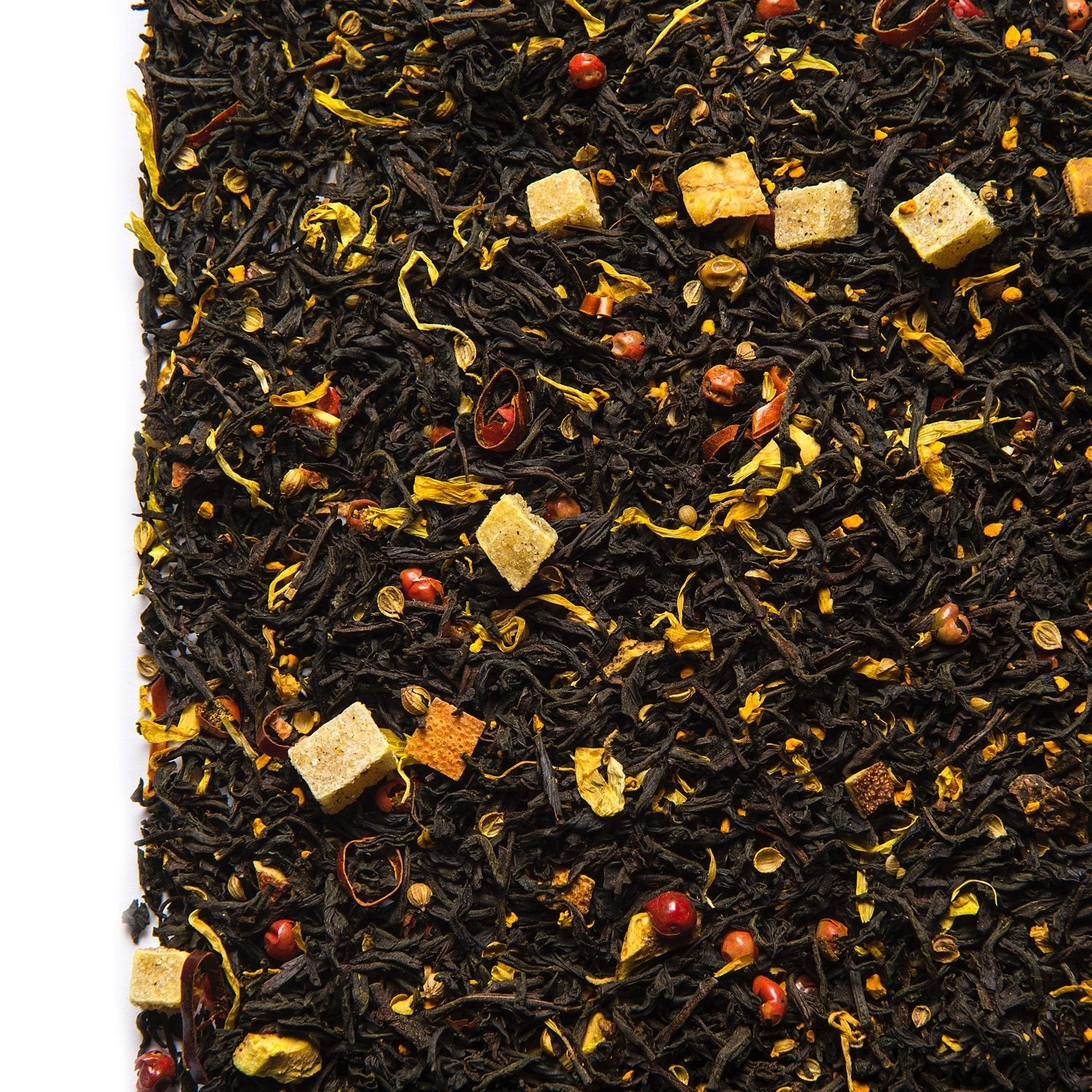 Zutaten: | Schwarzer Tee (69%), Kurkuma (8%), kandierte Ingwerstücke (Ingwer, Zucker), Orangenschalen, natürliches Aroma, Rosa Pfeffer, Koriander, Kardamom, Ringelblumenblüten, Chiliringe (1%) |