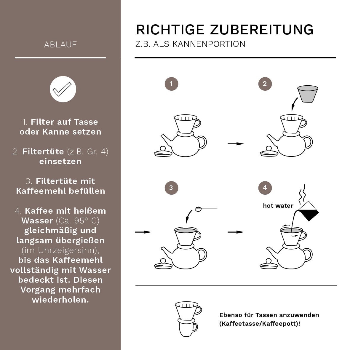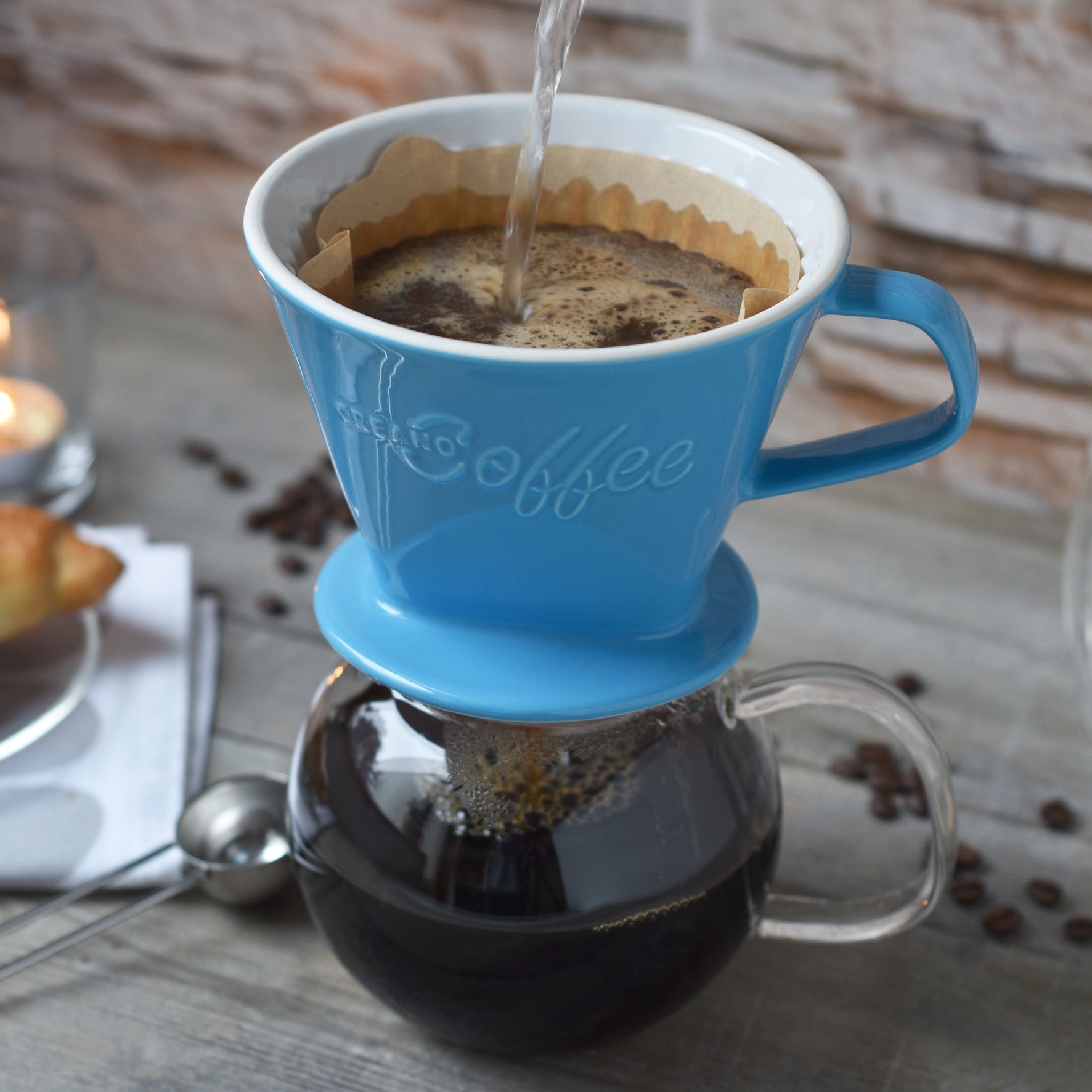 Einfach einen passenden Filter einsetzen, frisches Kaffeepulver einfüllen, heißes Wasser langsam darüber gießen und den gleichmäßig extrahierten Kaffee genießen.