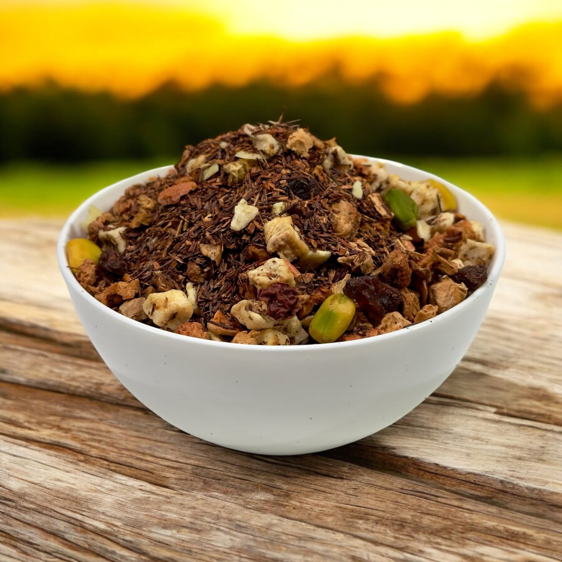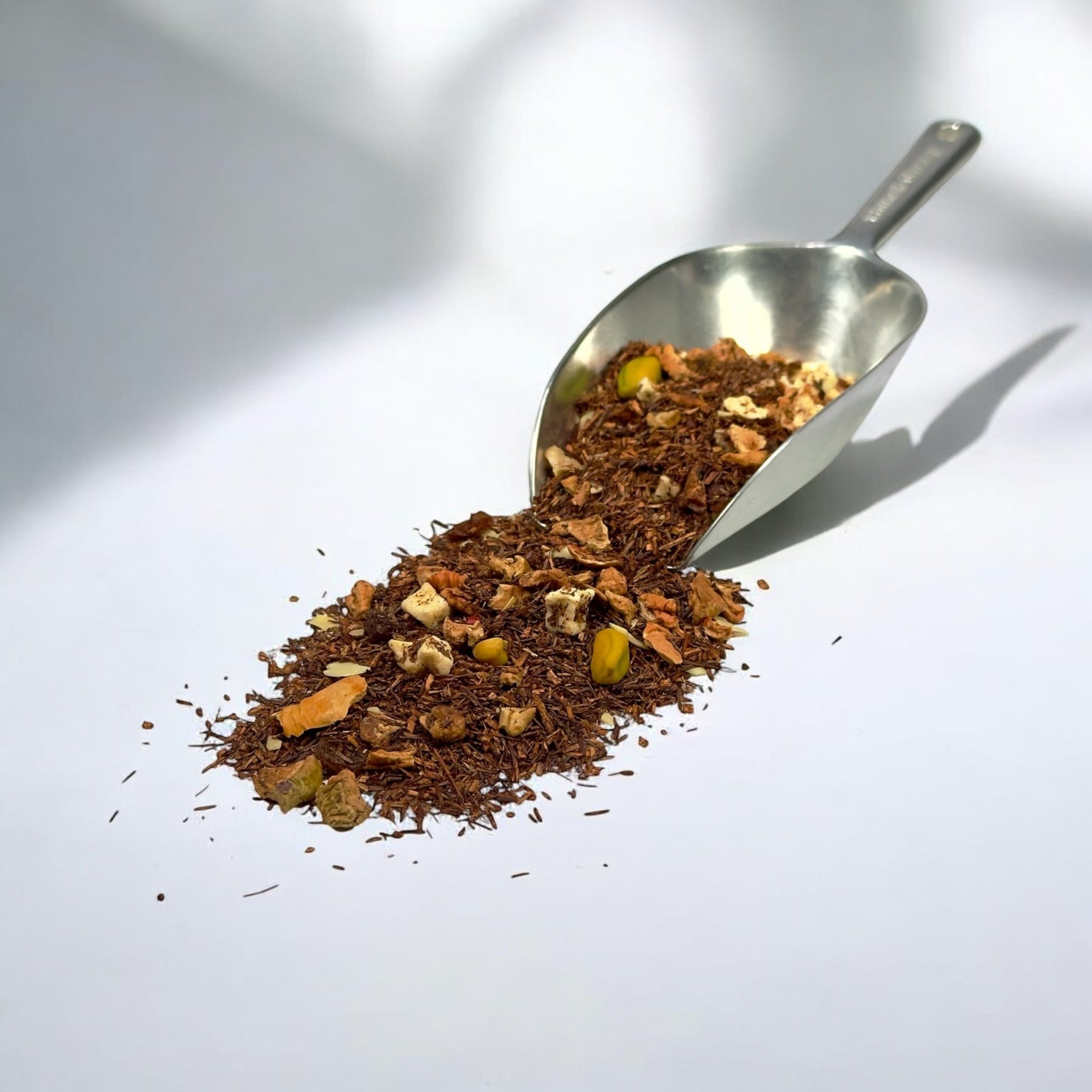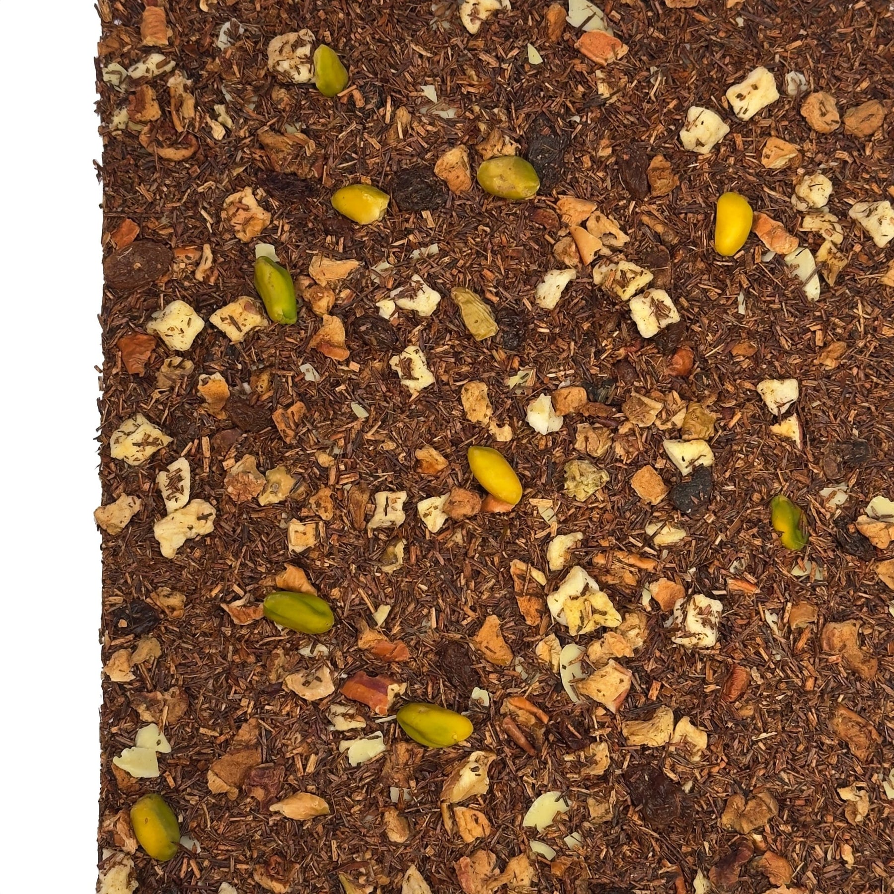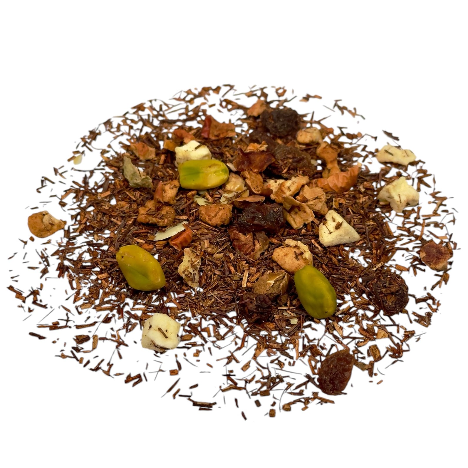 Zutaten: Rooibos, Apfelstücke (27 %), Weinbeeren, MANDELN gehobelt, PISTAZIENKERNE (5 %), Aroma