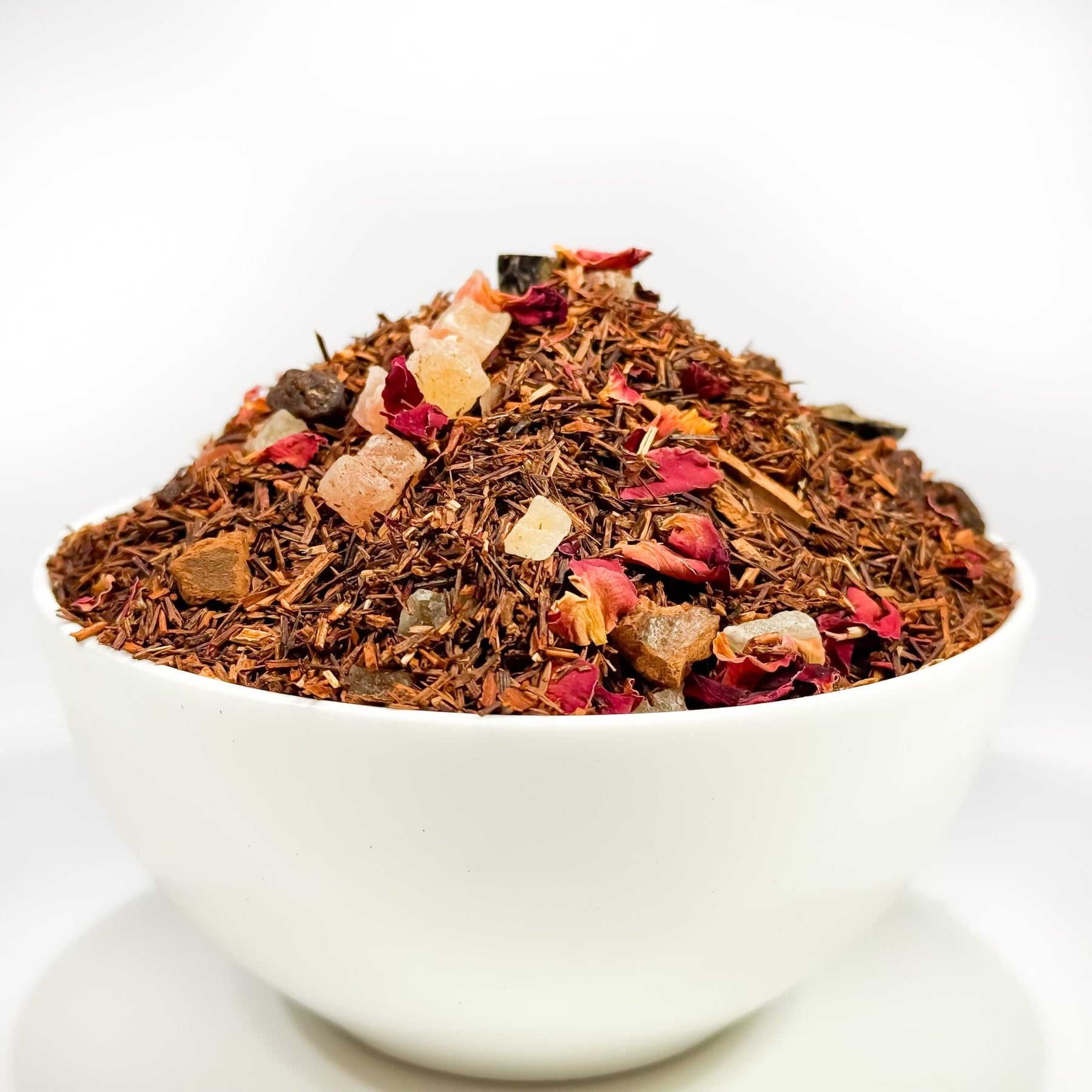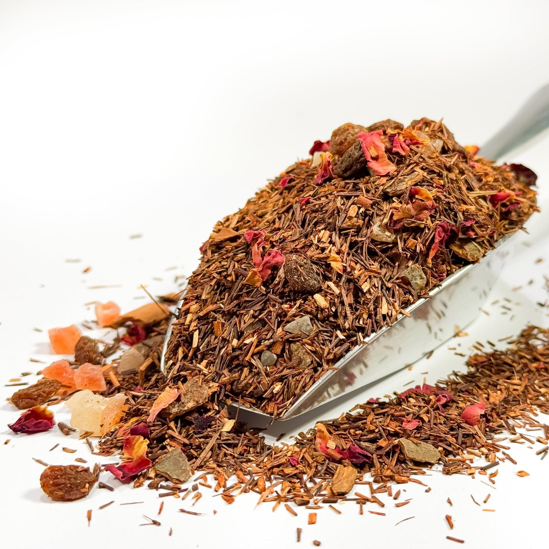 Auch wer keine Lust zum Backen hat, sollte diesen köstlichen Rooibos-Tee mit seinem Pflaume-Zimt-Duft unbedingt probieren. Der rote, etwas grasige Tee bietet die perfekte Grundlage für Frucht und Gewürz. Probieren Sie es selbst!