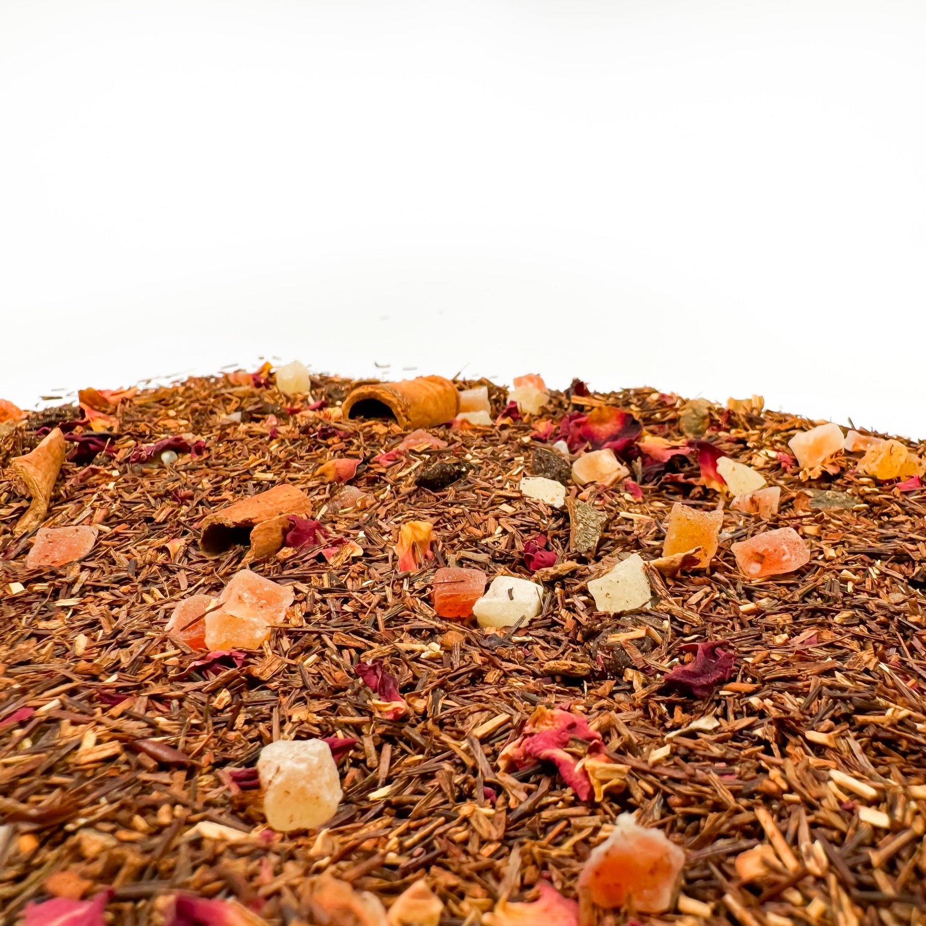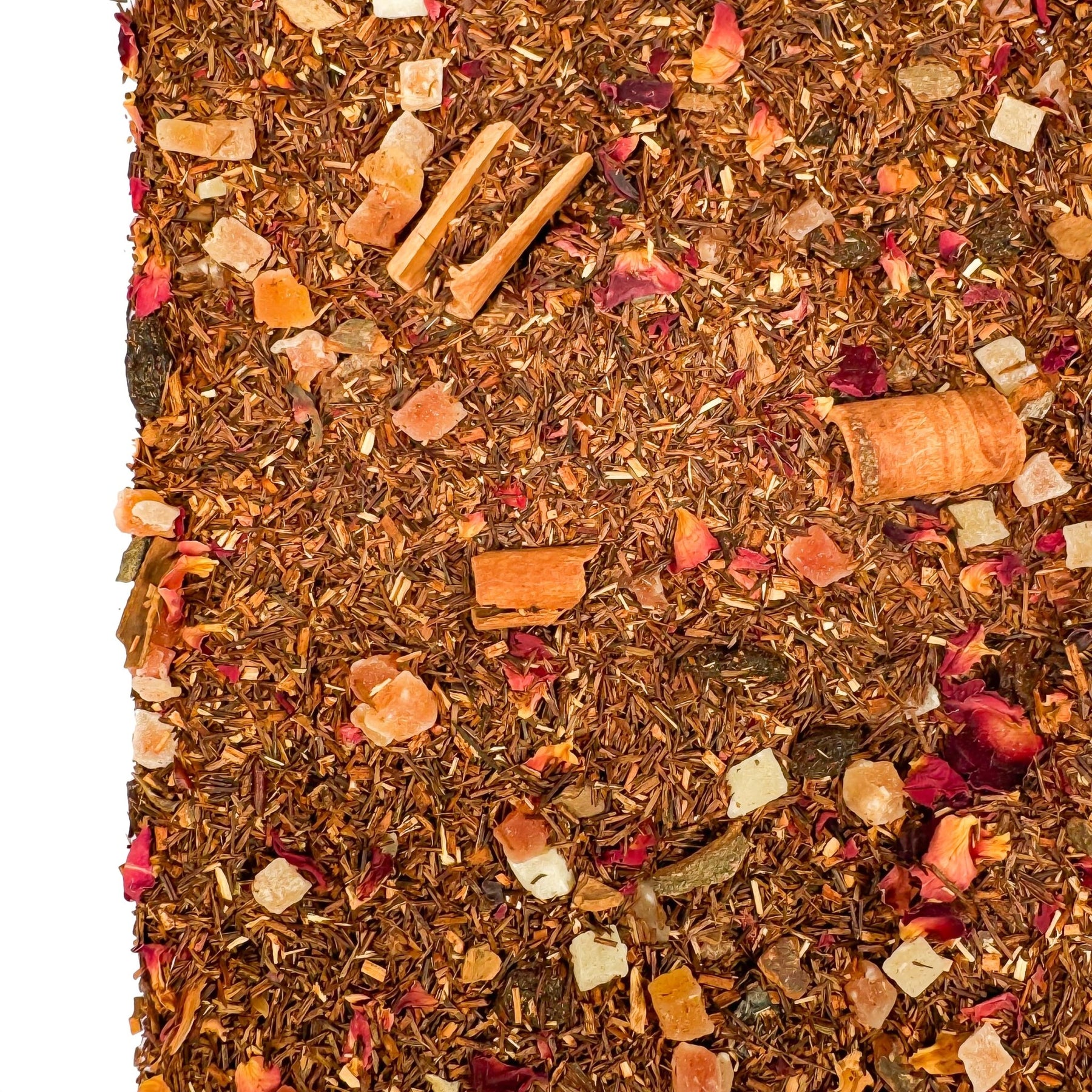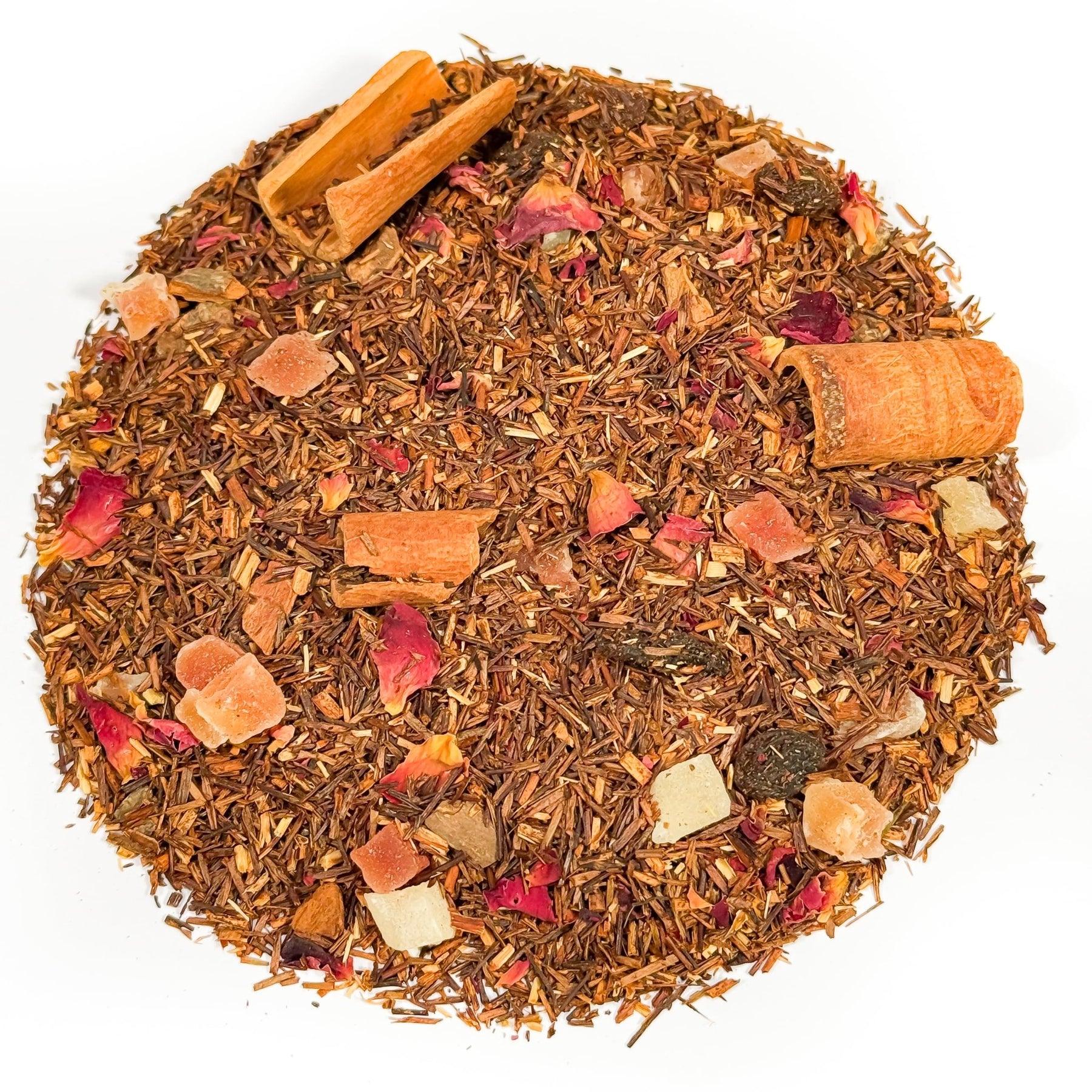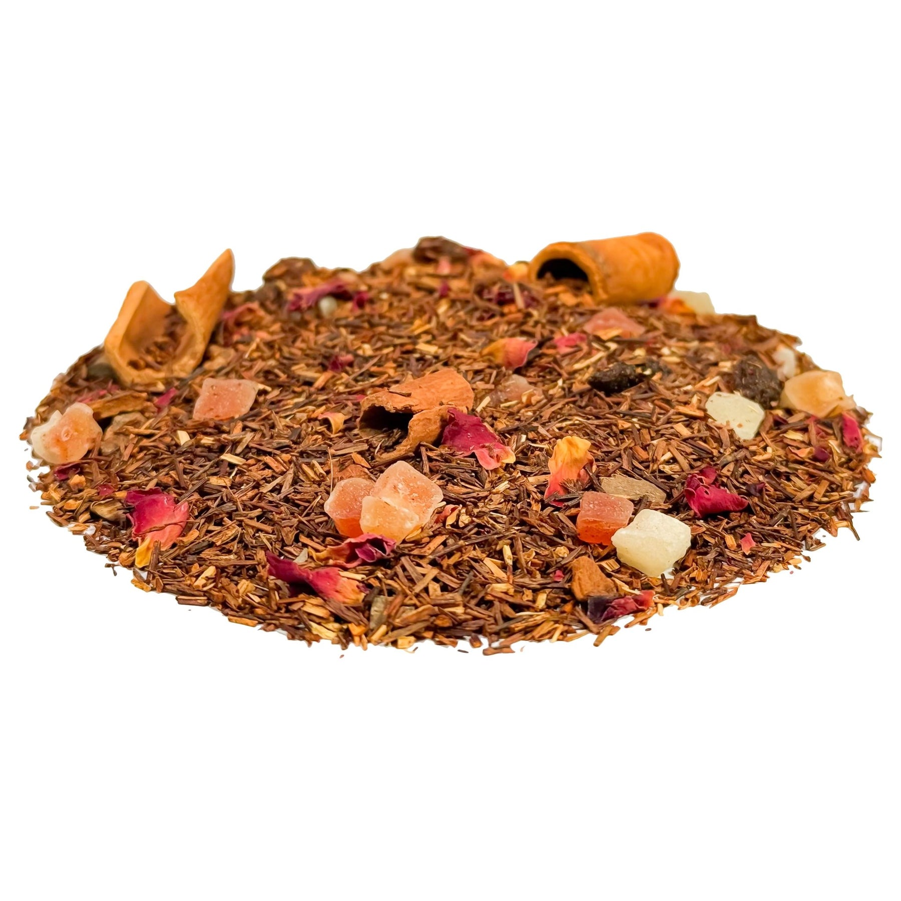 Zutaten: | Rooibos, kandierte Papayastücke (Papaya, Zucker), Weinbeeren, Zimtrinde (6%), Aroma, Zimtstangen(4%), Pflaumenstücke (3%), Rosenblütenblätter |