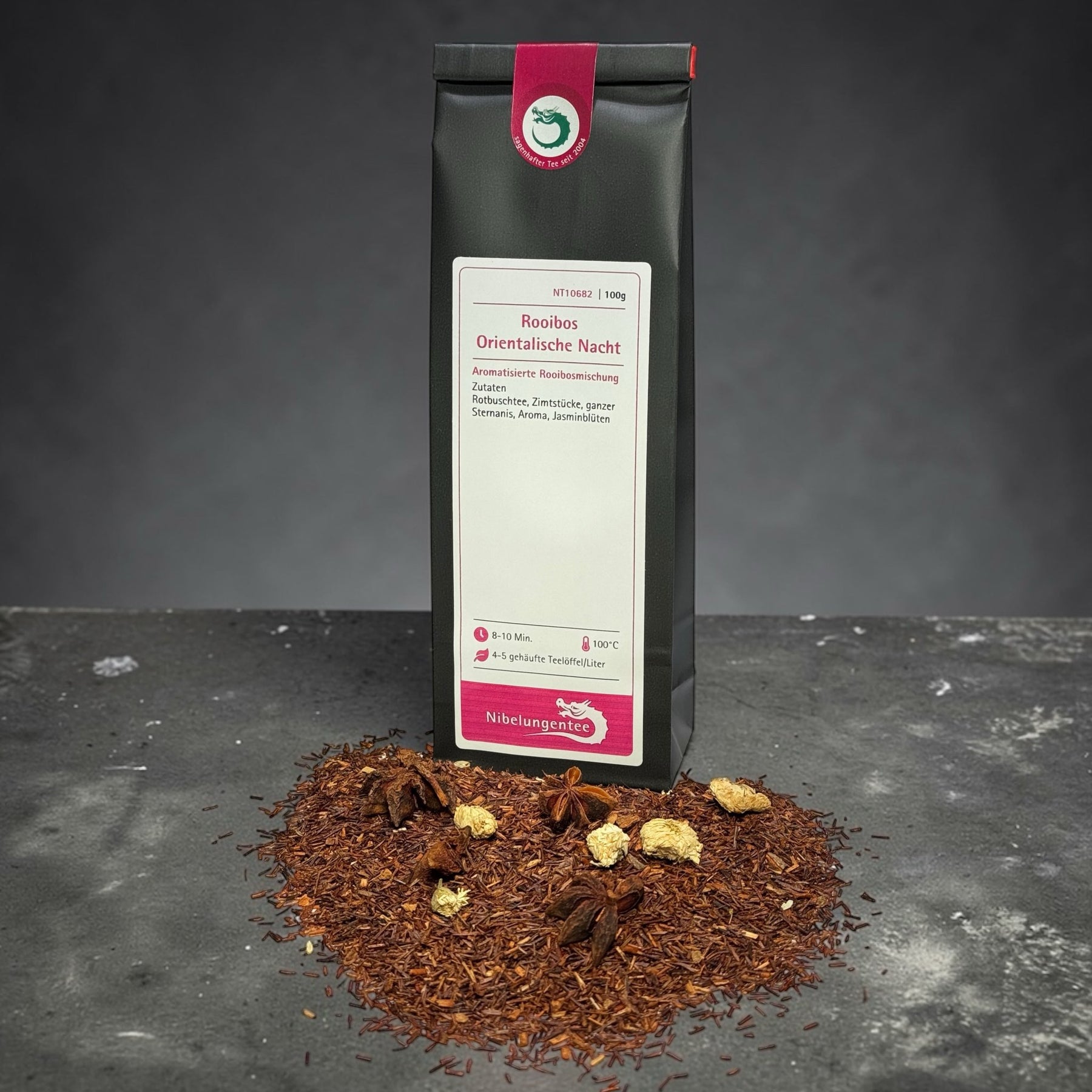 | Zutaten: | Rotbuschtee, Zimtstücke, ganzer Sternanis, Aroma, Jasminblüten |