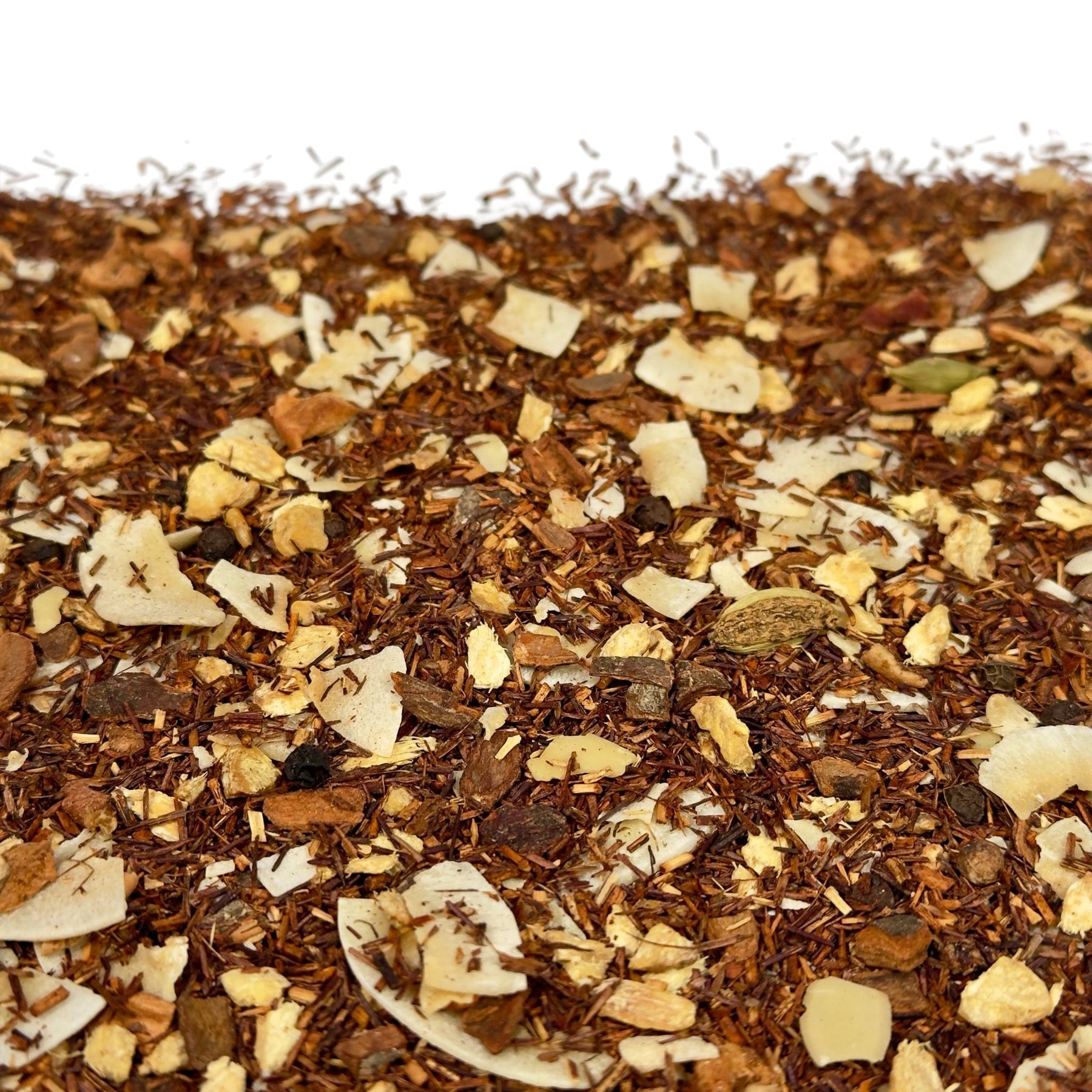 | Zutaten: | Rooibos, Ingwerstücke (18%), Kokoschips (Kokosnuss, Zucker) (15%), Zimtrinde, Apfelstücke, Aroma, Kardamom, schwarzer Pfeffer, MANDELFLAKES |