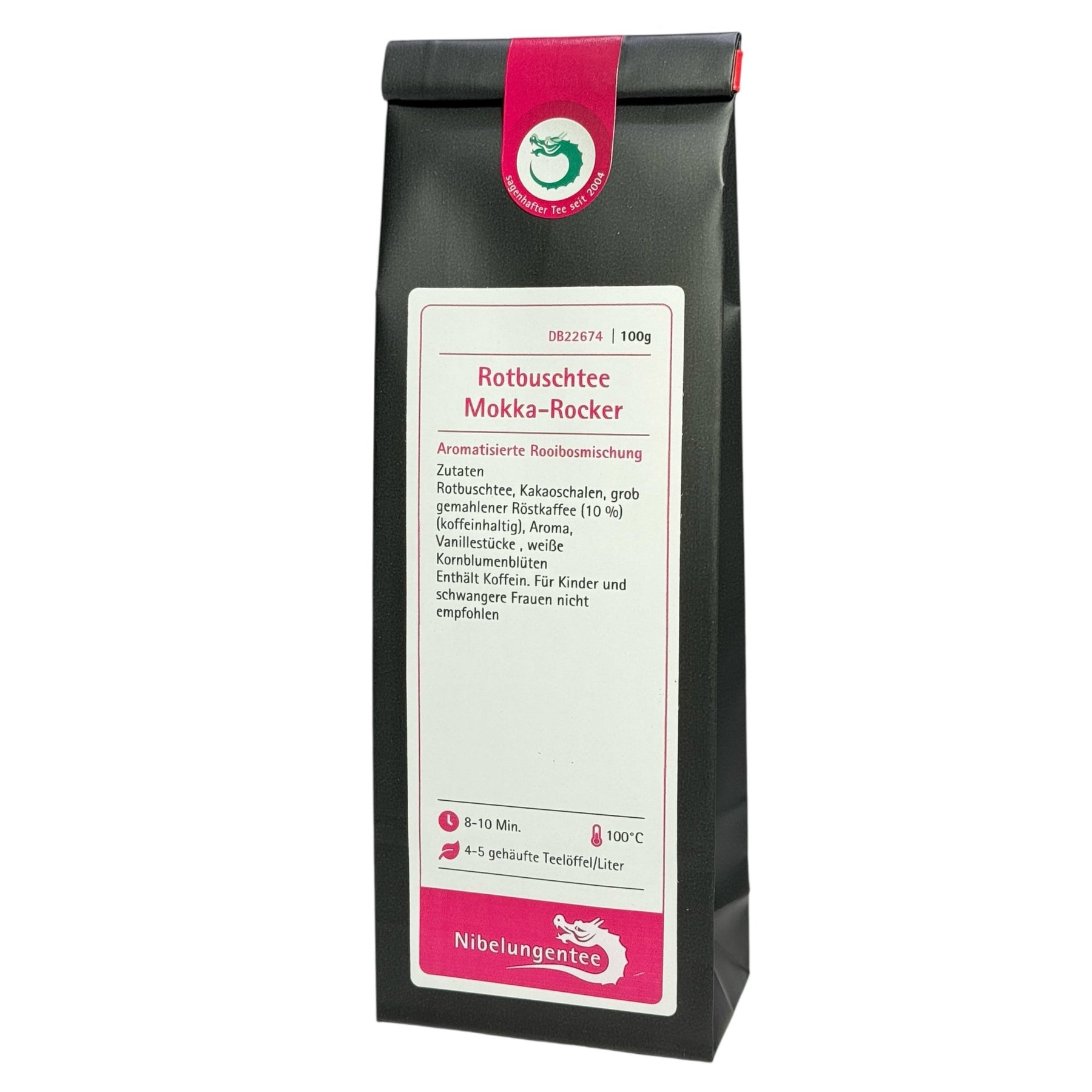 | Zutaten: | Rotbuschtee, Kakaoschalen, grob gemahlener Röstkaffee (10 %) (koffeinhaltig), Aroma, Vanillestücke , weiße Kornblumenblüten |