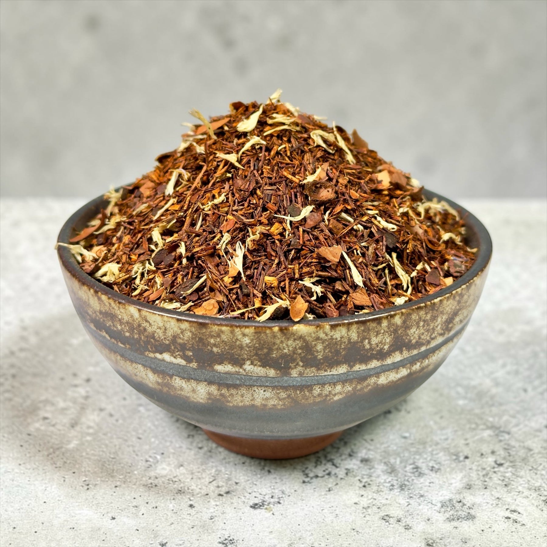Die Grundlage bildet Rotbuschtee, der ursprünglich aus Südafrika stammt und für seine angenehm milde, leicht süßliche Note bekannt ist. Seine warme, rotbraune Farbe und das runde Aroma schaffen eine ruhige Bühne für die intensiveren Geschmacksnuancen der Mischung.
