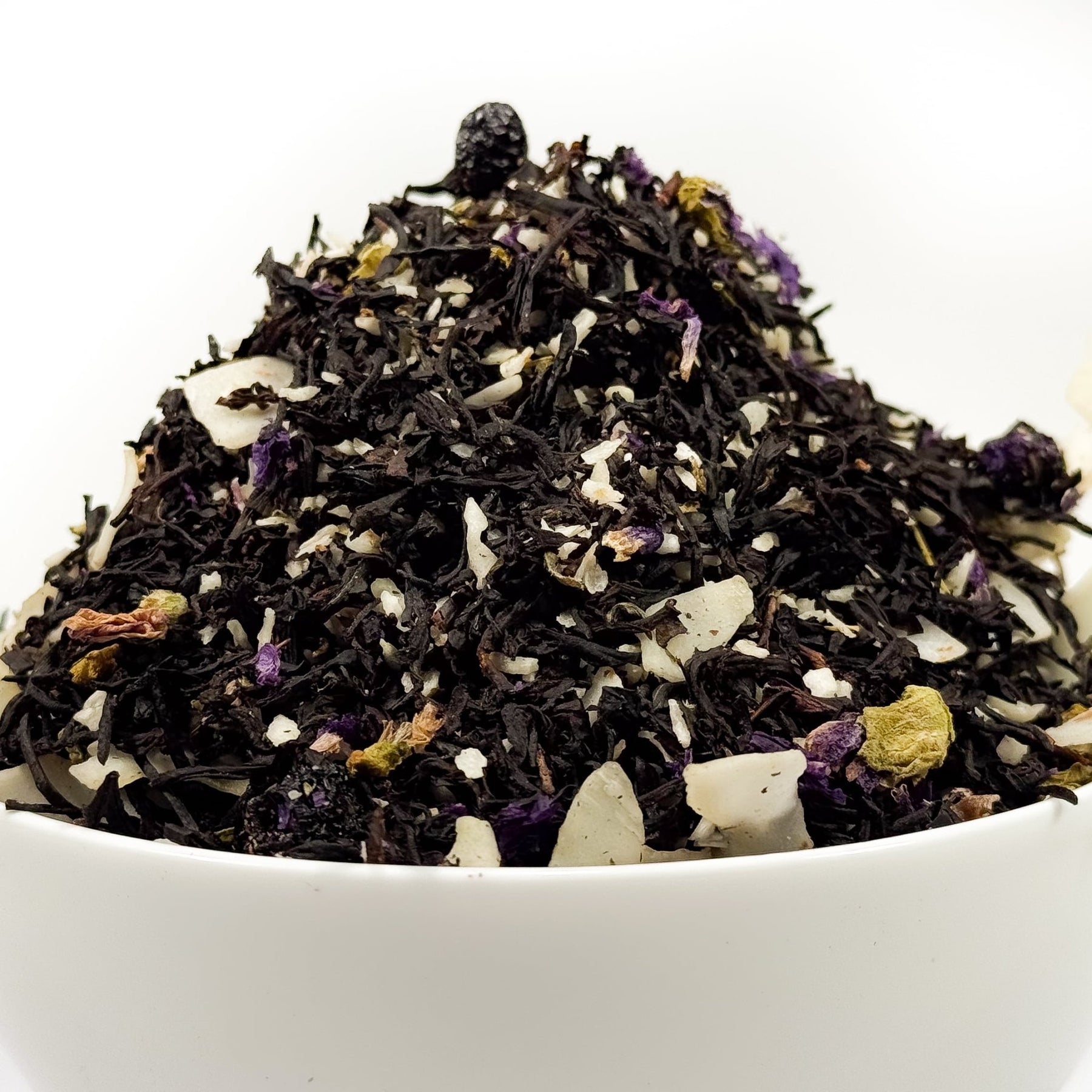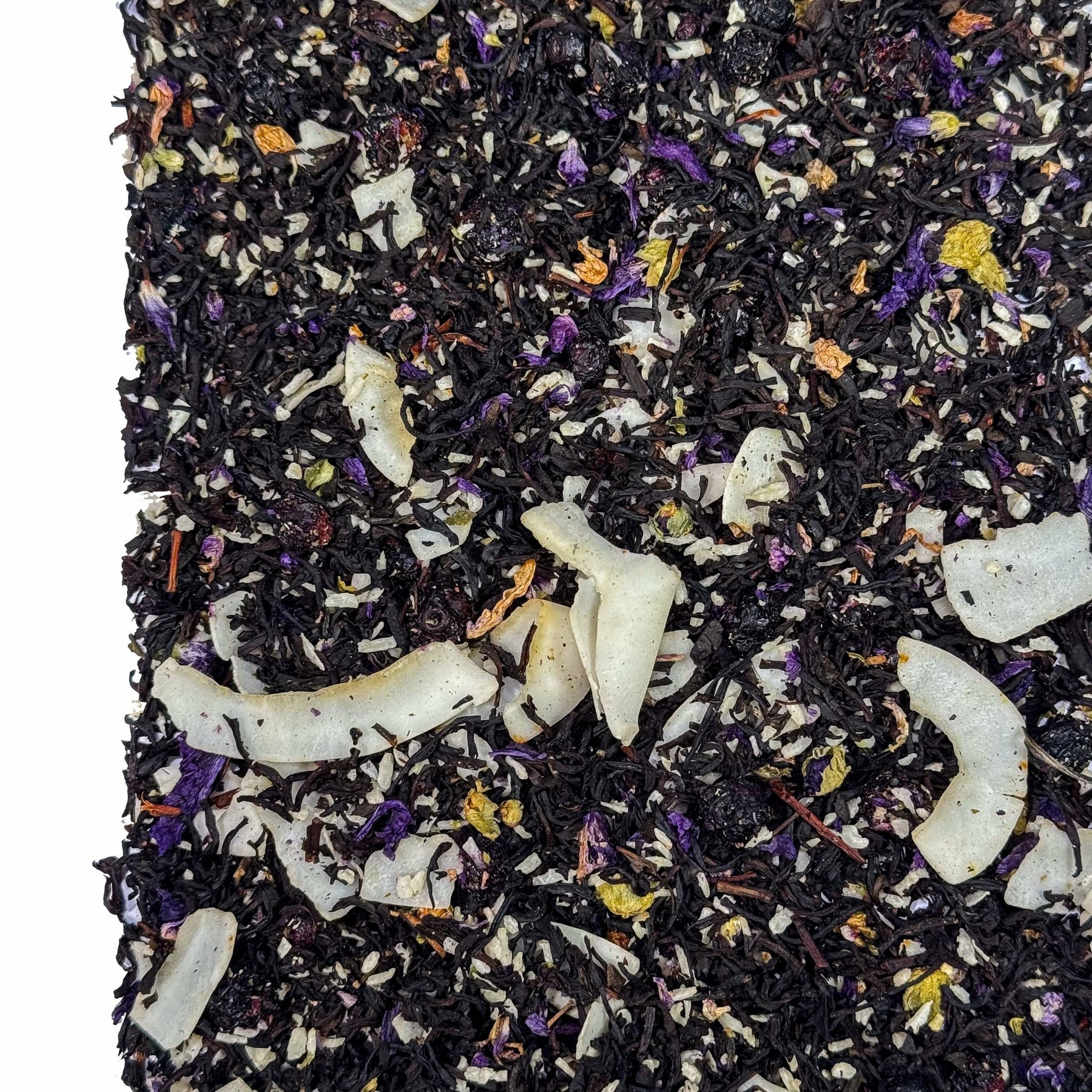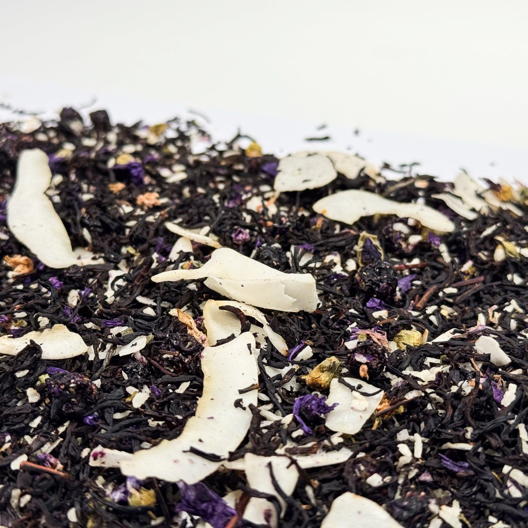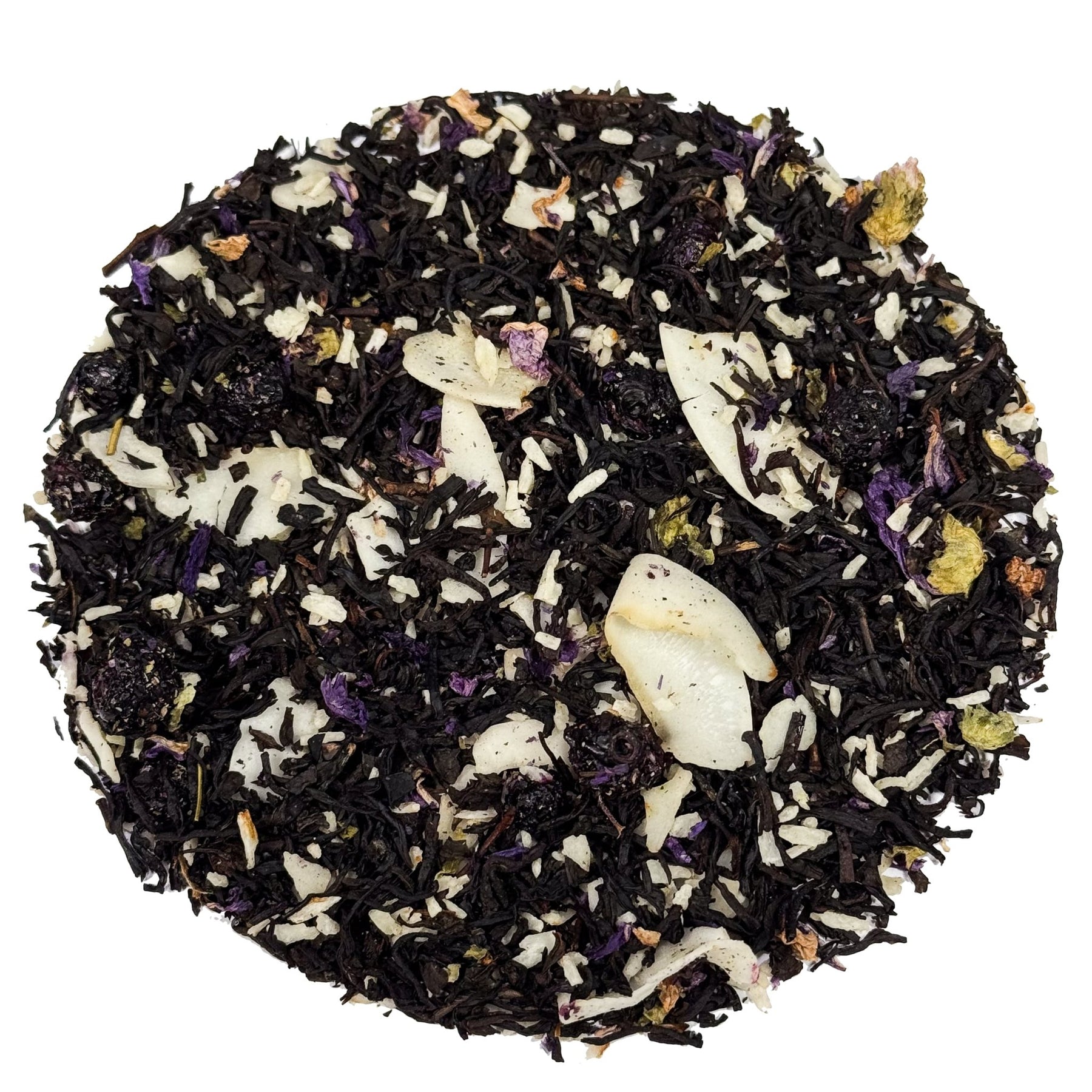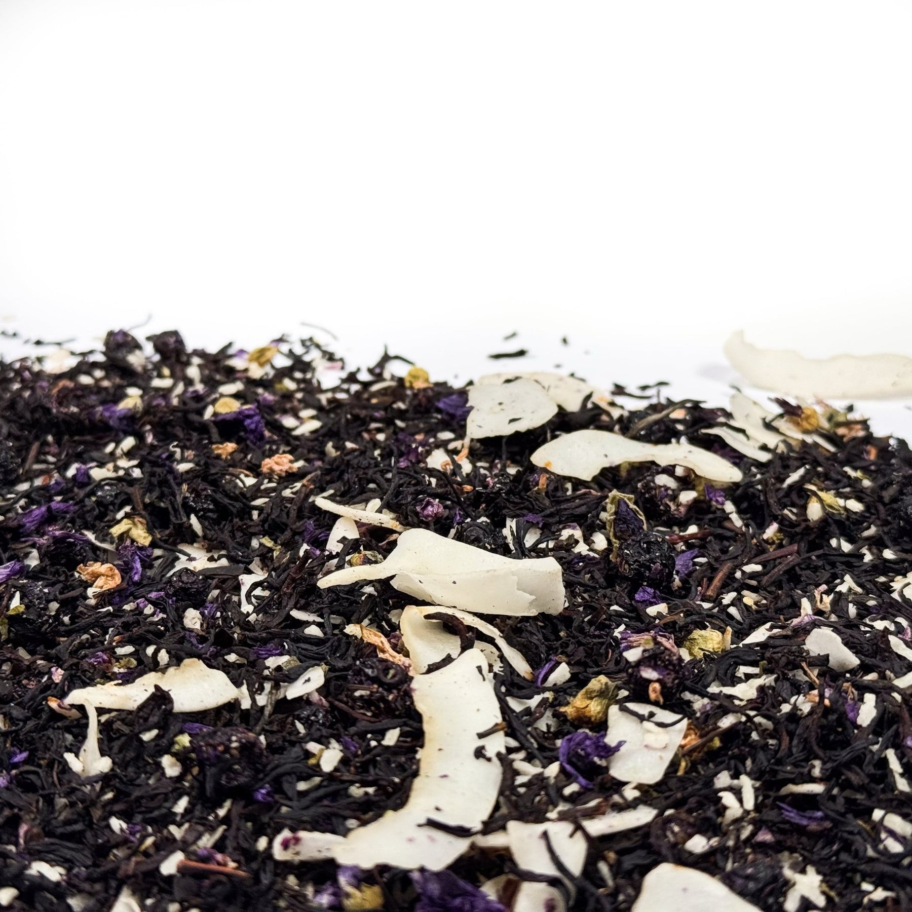 Zutaten: schwarzer Tee (65 %), Kokosraspeln, Kokoschips, Aroma, gefr.-getr. Heidelbeeren, Malvenblüten