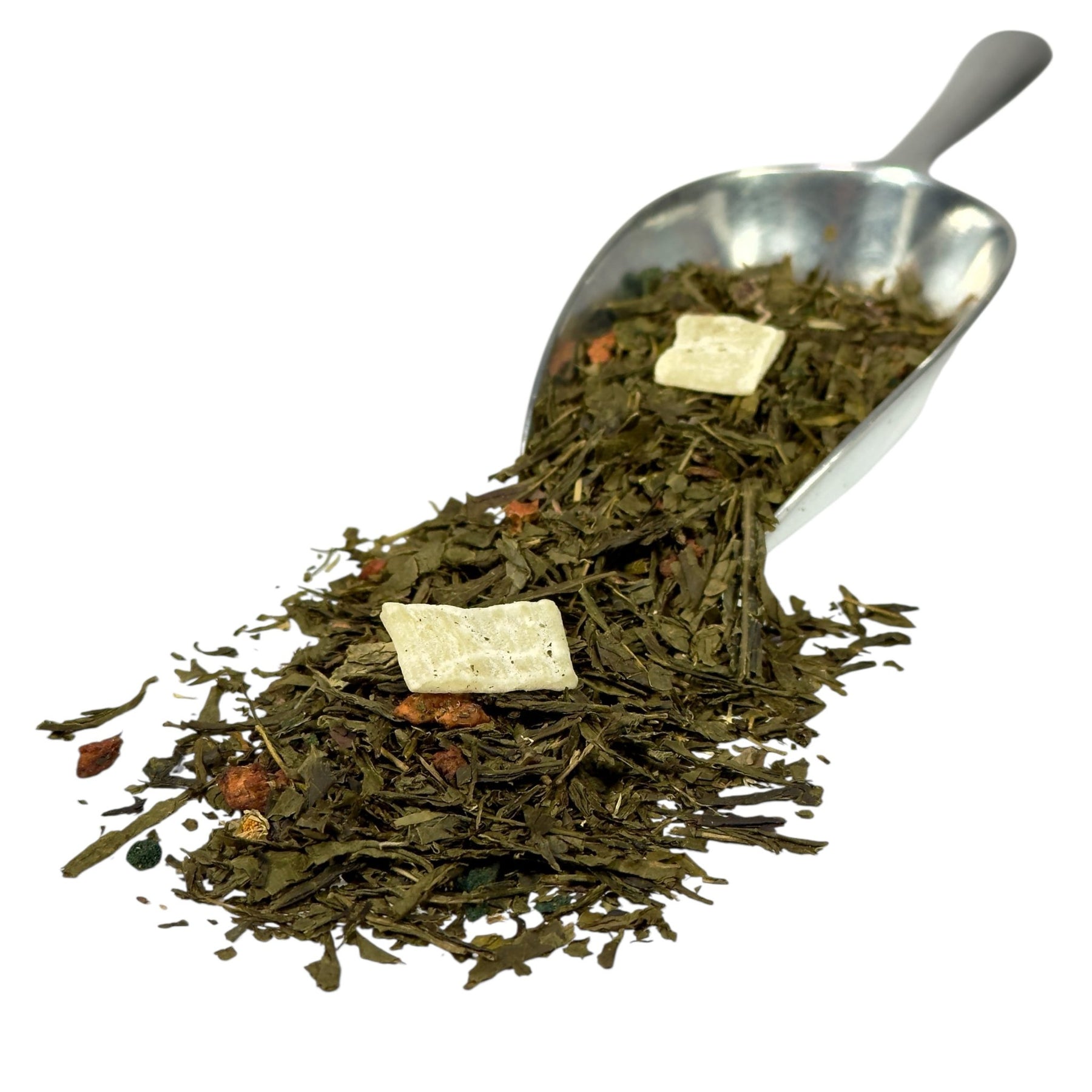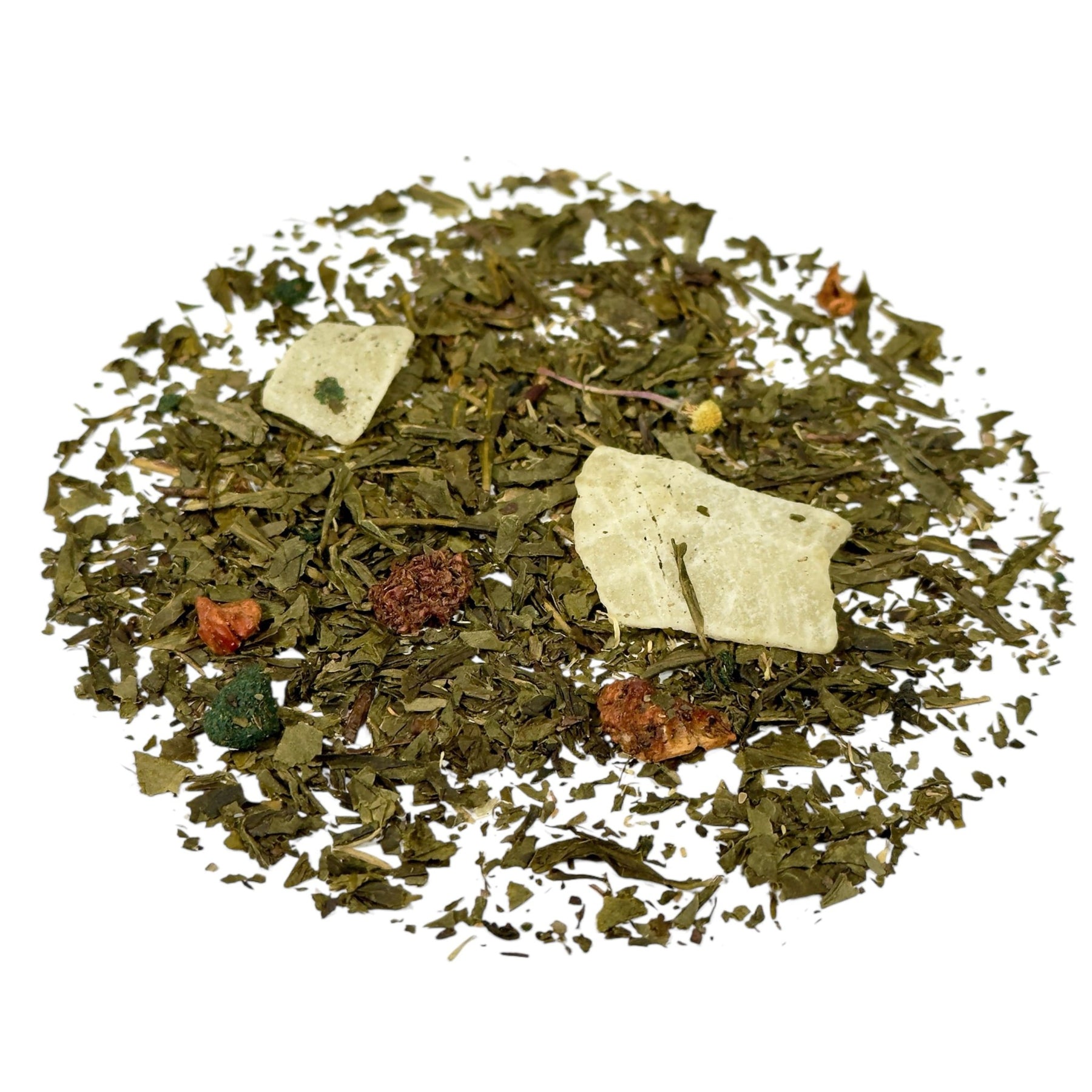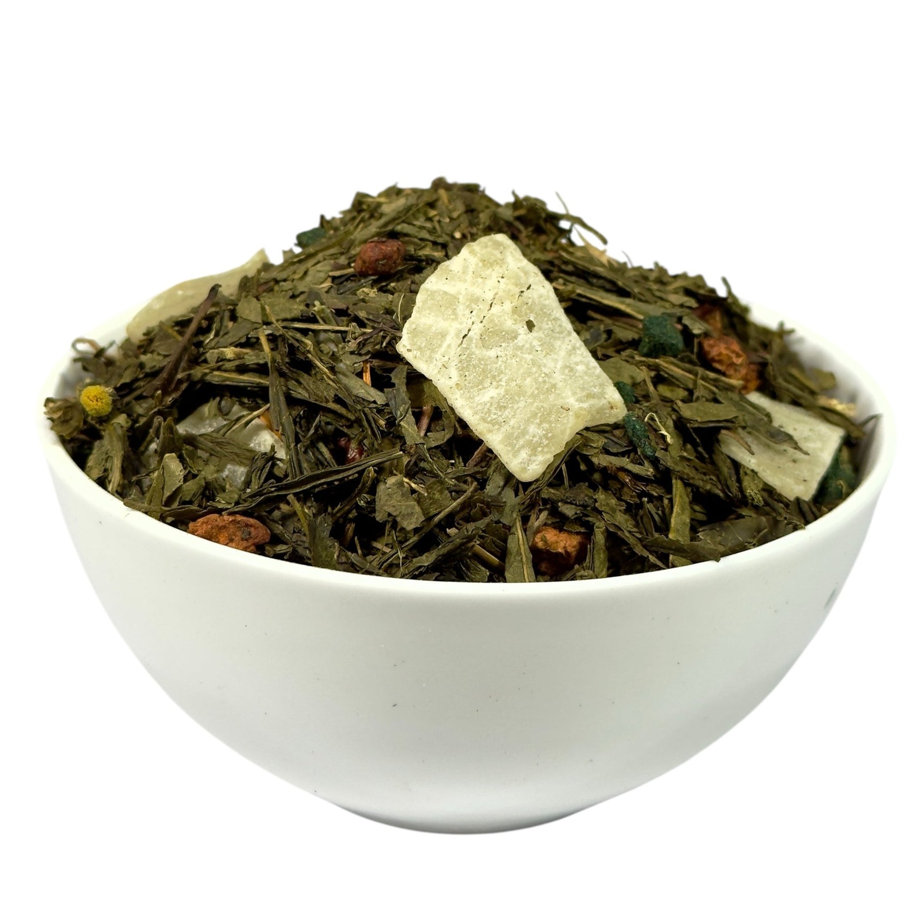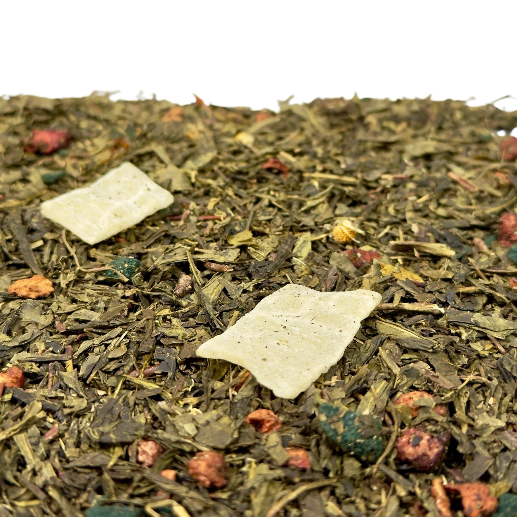 Aloe Vera im Tee – das klingt nach einer spannenden Überraschung! Die zarten Stückchen verleihen dem Aufguss eine feine, leicht exotische Note, die wunderbar mit fruchtigen oder blumigen Zutaten harmoniert. Sie bringen eine besondere Frische mit, die den Tee nicht nur geschmacklich abrundet, sondern ihm auch eine interessante Textur verleiht. Besonders in Kombination mit den anderen leichten, sommerlichen Aromen sorgt Aloe Vera für ein außergewöhnliches Genusserlebnis.