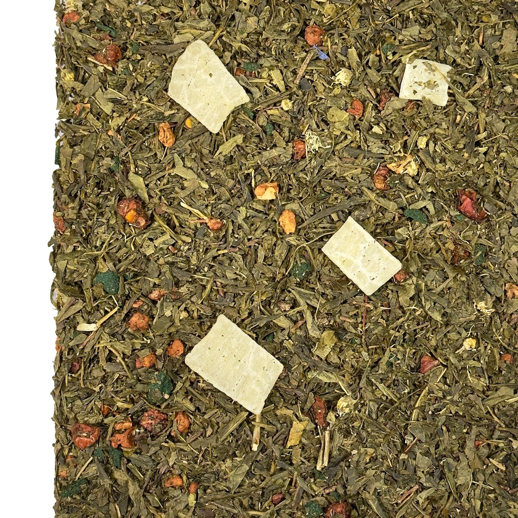 Zutaten: grüner Tee (81%), Kandierte Aloe Vera (Aloe Vera, Zucker), gesäuerte Apfelstücke (Apfel, Säuerungsmittel: Citronensäure), Aroma, gefr.-getr. Apfel-Spirulina Crunchy (Apfelmuskonzentrat mit Antioxidans: Ascorbinsäure, Spirulina platensis) (2%), Gänseblümchen ganz