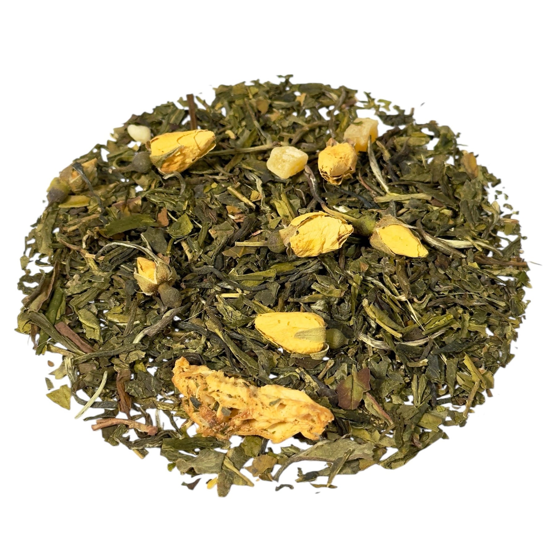 Zwischen den edlen Teesorten blitzen immer wieder kleine Highlights auf, die neugierig machen. Gelbe Rosenknospen setzen elegante, florale Akzente und unterstreichen den hochwertigen Charakter der Mischung. Sie wirken nie aufdringlich, sondern fügen sich sanft ein und sorgen für eine feine, frische Leichtigkeit, die wunderbar mit den Tees harmoniert.