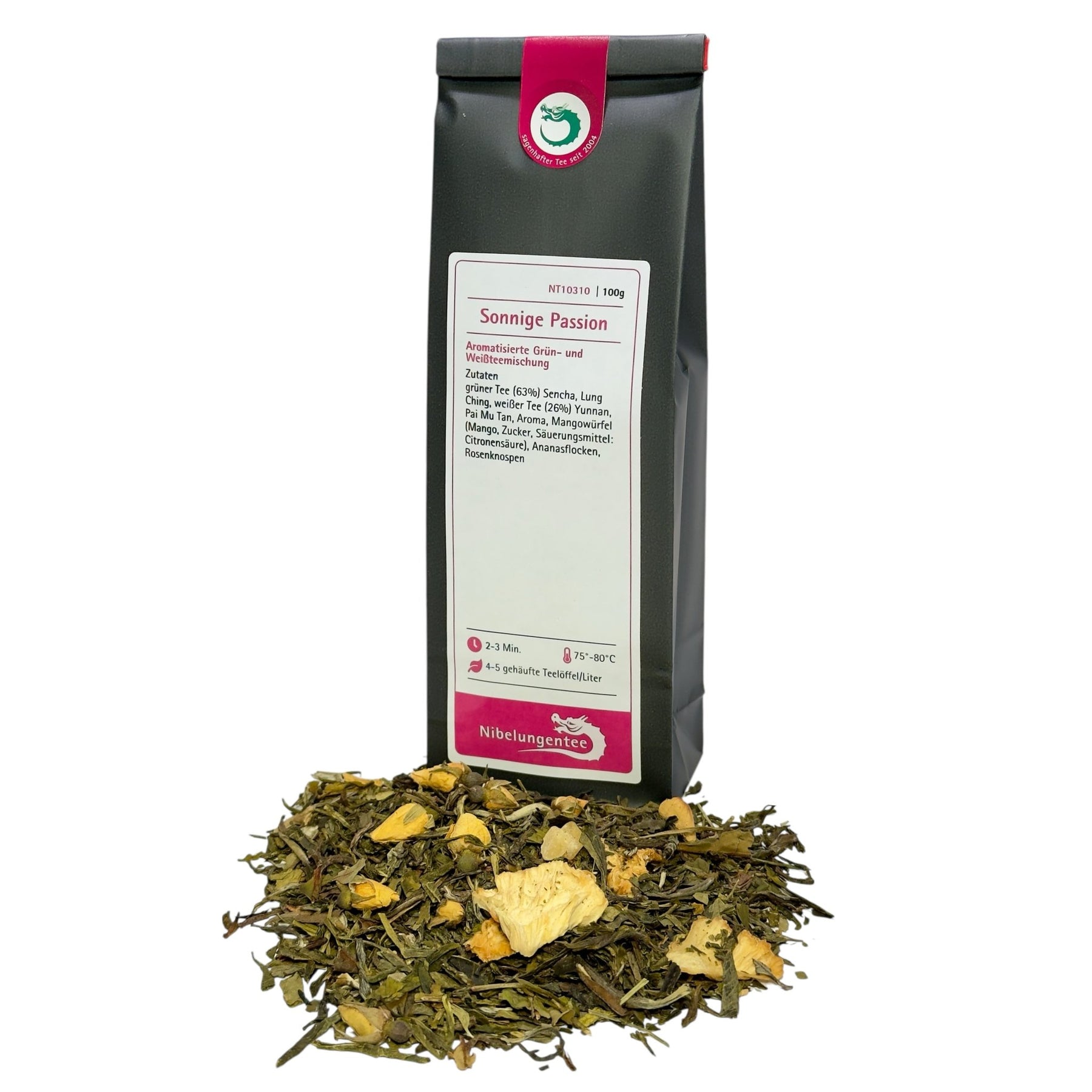 | Zutaten: | grüner Tee (63%) Sencha, Lung Ching, weißer Tee (26%) Yunnan, Pai Mu Tan, Aroma, Mangowürfel (Mango, Zucker, Säuerungsmittel: Citronensäure), Ananasflocken, Rosenknospen |