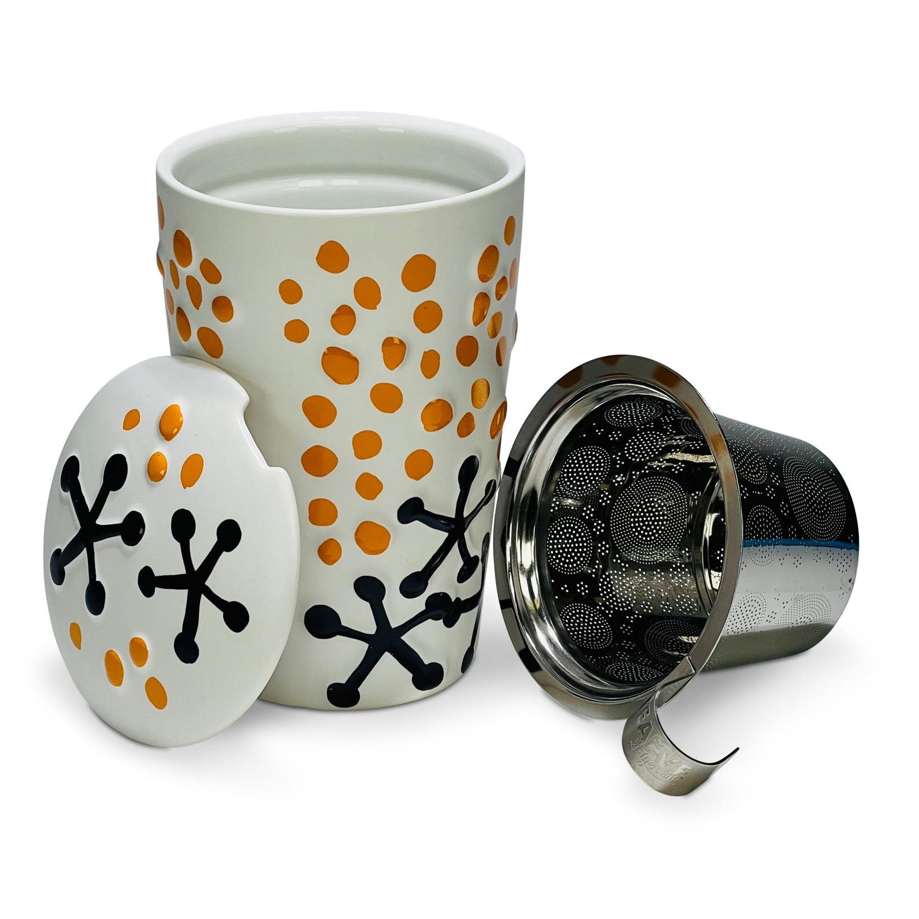 feines, doppelwandiges Porzellan, Edelstahlsieb und Porzellandeckel.